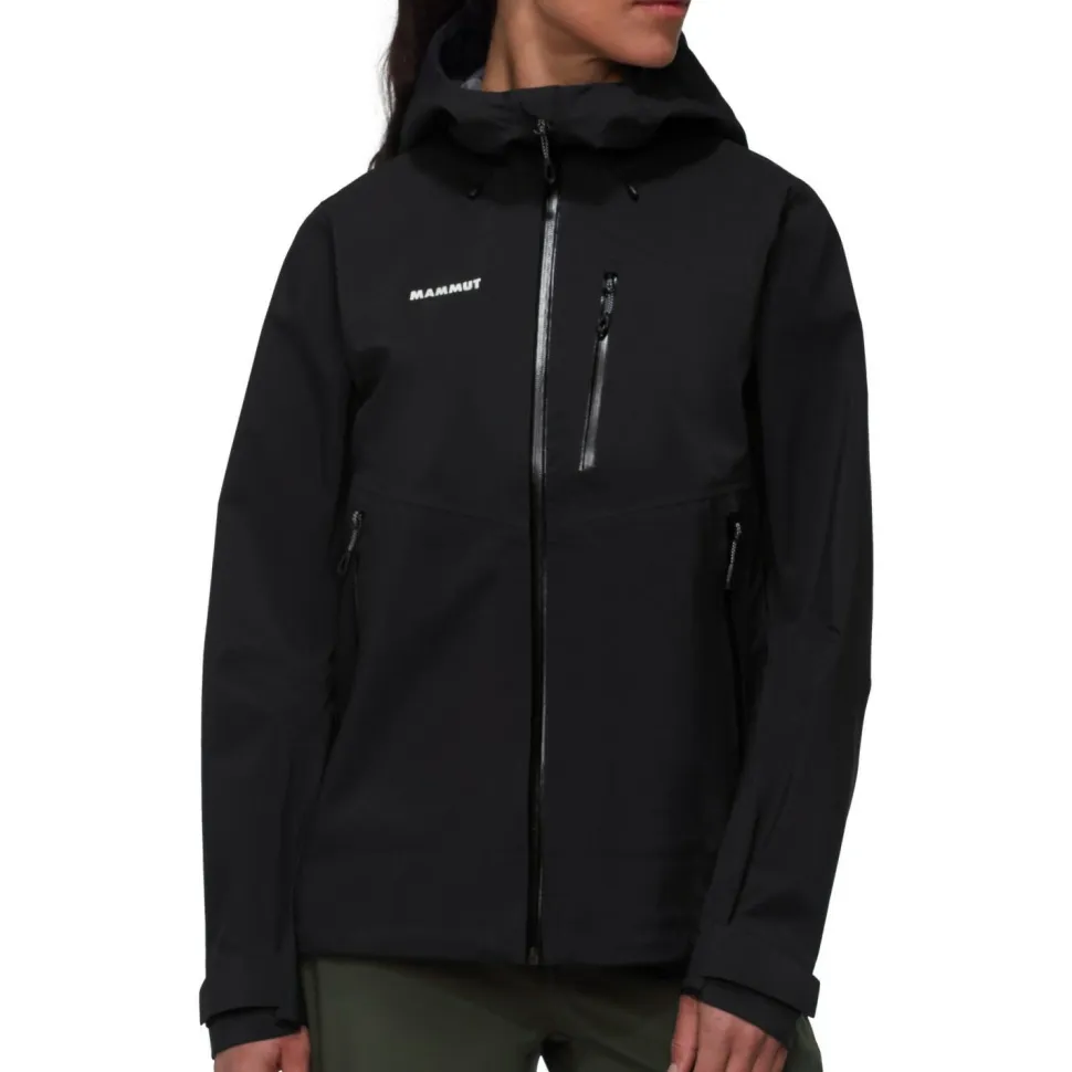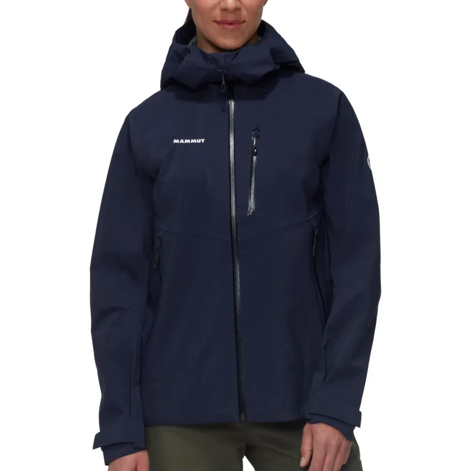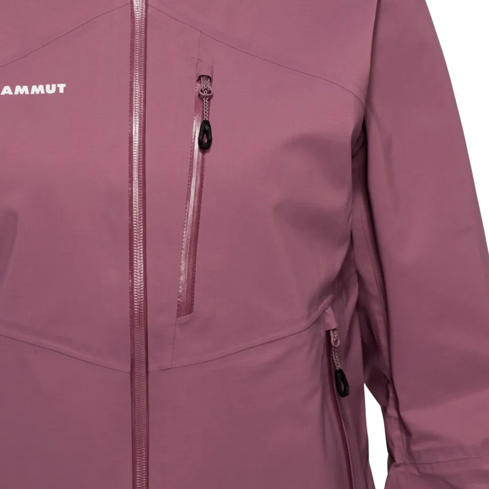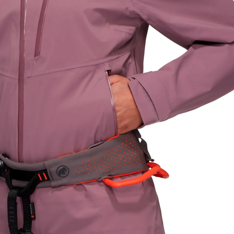 Die Women’s Alto Guide Hardshell Hooded Jacket von Mammut verfügt über zwei praktische Fronttaschen, die auch mit angelegtem Klettergurt bequem zu erreichen sind. Auch die wasserdichte Kapuze passt bequem über den Kletterhelm. Mammut stattet die Bergsportjacke mit einem wasserabweisenden Frontreißverschluss aus und ergänzt die Atmungsaktivität mit Ventilationsöffnungen unter den Armen. Eine PFC-freie DWR-Behandlung an der Oberfläche lässt Wassertropfen und Schmutzpartikel effizient an der Jacke abperlen. Vorgeformte Ärmel, eine regulierbare Saumweite mit Kordelzug und eine extra Brusttasche machen die strapazierfähige Hardshelljacke komplett.