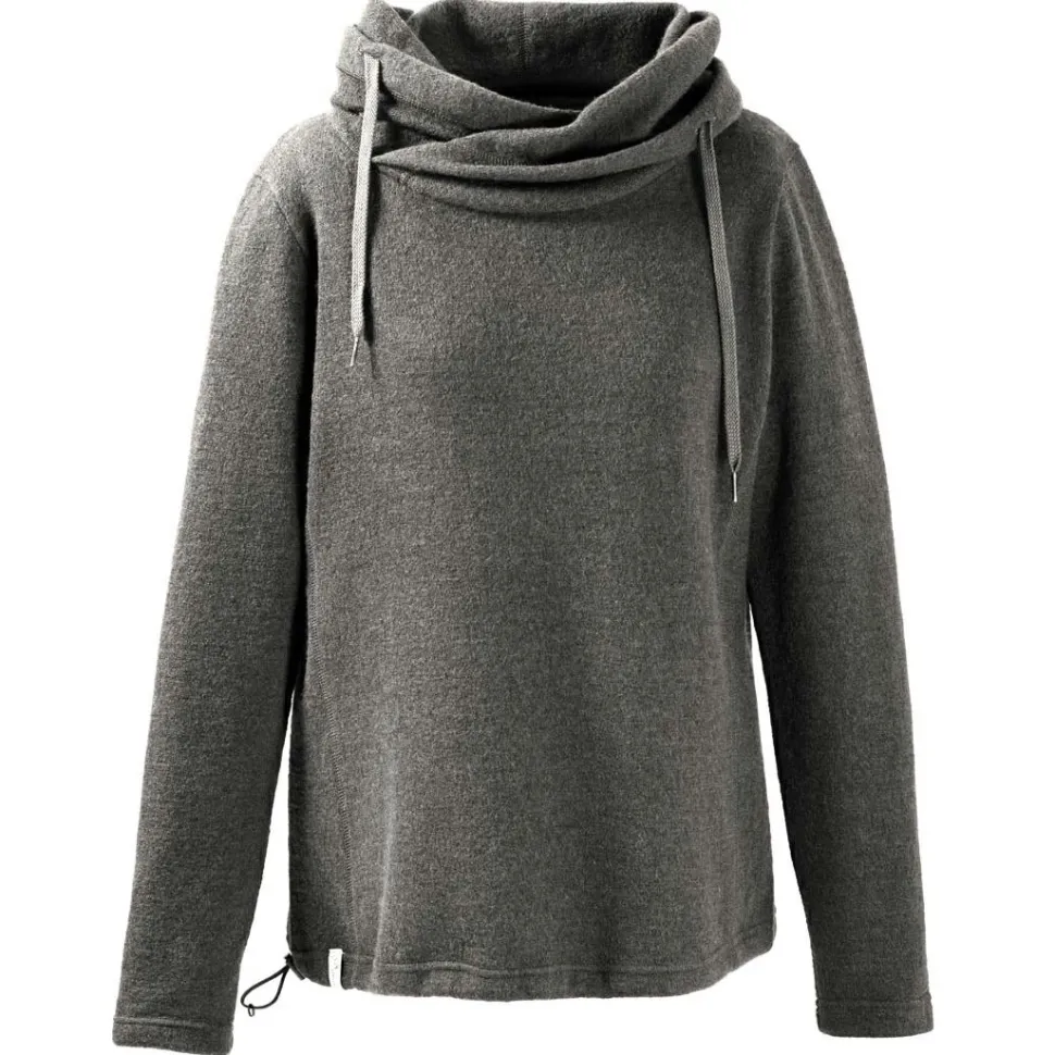Hingucker mit Gemütlichkeitsfaktor – Der Clou beim Women’s Kusa Wollpullover von Mufflon ist die extraweite Kapuze, die sich mit einem Kordelzug individuell einstellen lässt.