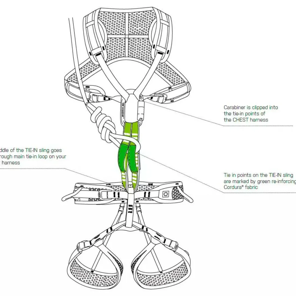 Der Brustgurt lässt sich aufgrund der beiden Slide-Lock-Schnallen problemlos verstellen und sitzt so auch mit mehreren Kleidungsschichten noch angenehm. Besonders praktisch ist aber auch die Verbindeschlinge. Diese wird einfach zur Hälfte durch die Anseilschlaufe des Sitzgurts geführt. Daraufhin werden die beiden Enden nach oben geklappt und mittels Karabiner am Brustgurt eingehängt. Ein Seil oder eine Klettersteigset, kann daraufhin in die Anseilschlaufen der Verbindeschlinge eingebunden werden.