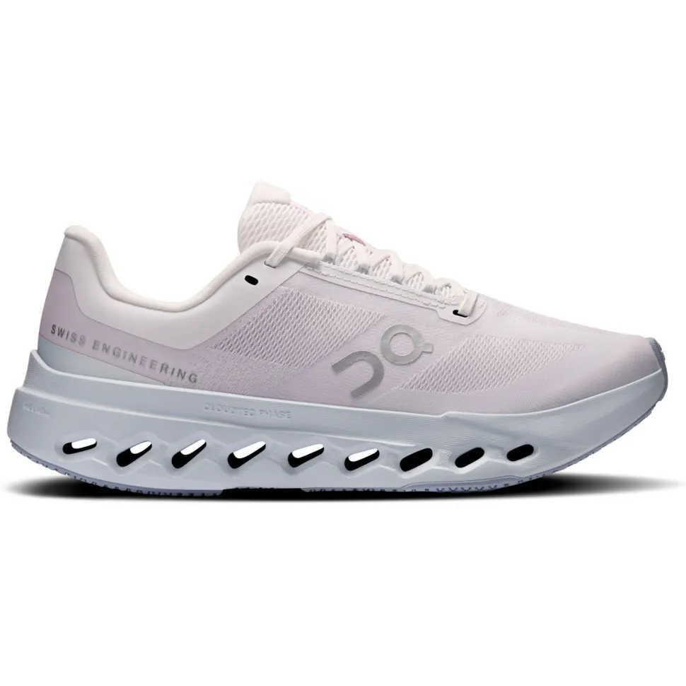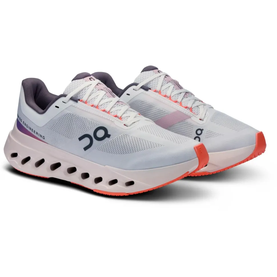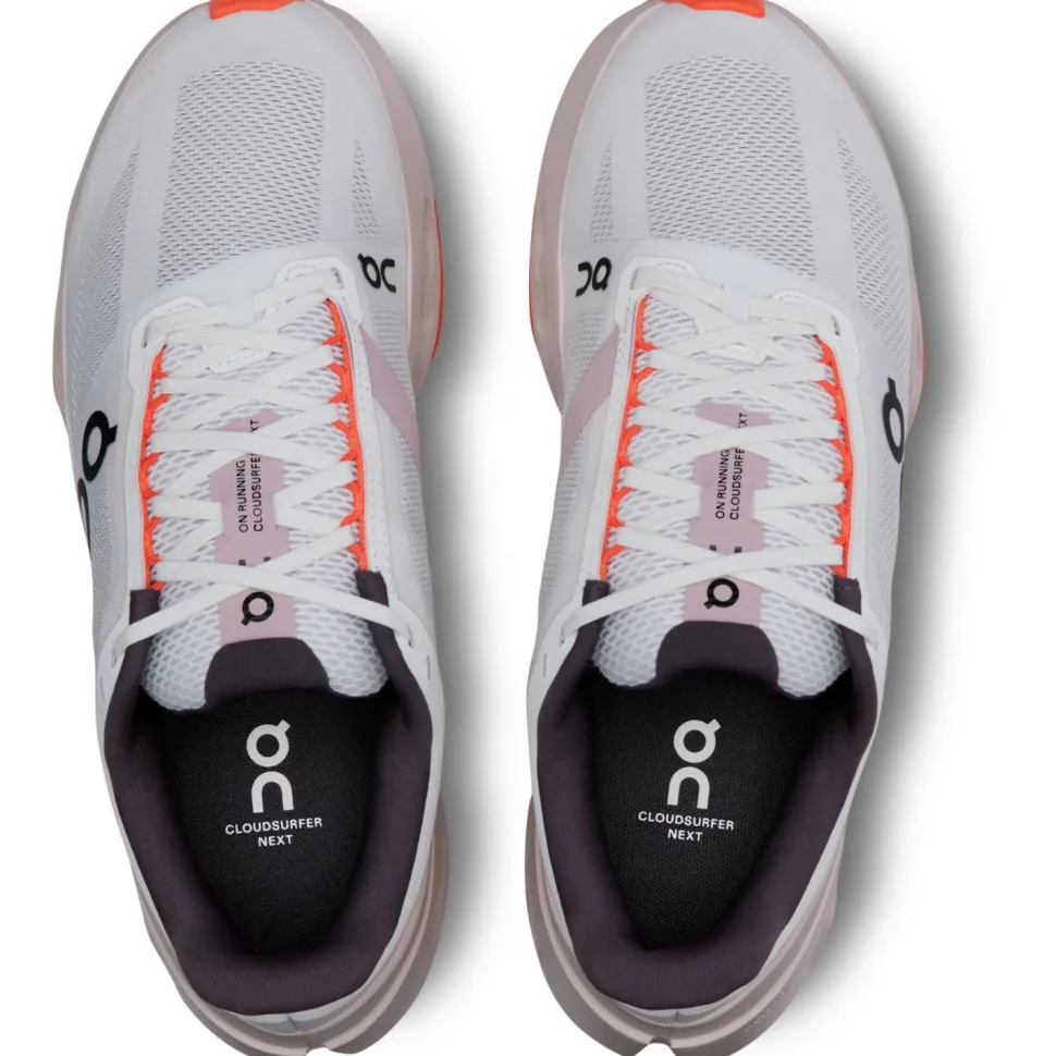 Sowohl im Training als auch beim Wettkampf begleiten Dich die On Women’s Cloudsurfer Next Runningschuhe. Neben dem patentierten CloudTec-System, das eine besonders weiche Landung, aber gleichzeitig einen kräftigen Abstoß fördert, wurde auch eine ganz spezielle Prägung auf der Außensohle verarbeitet. Diese neue Form bietet optimalen Halt und Traktion, besonders bei nassen und etwas rutschigem Asphalt. Durch die Mittelsohle, die aus hochwertigem EVA besteht, ist der Schuh zum einen besonders strapazierfähig und langlebig und die Stoßdämpfung wird zusätzlich unterstützt.