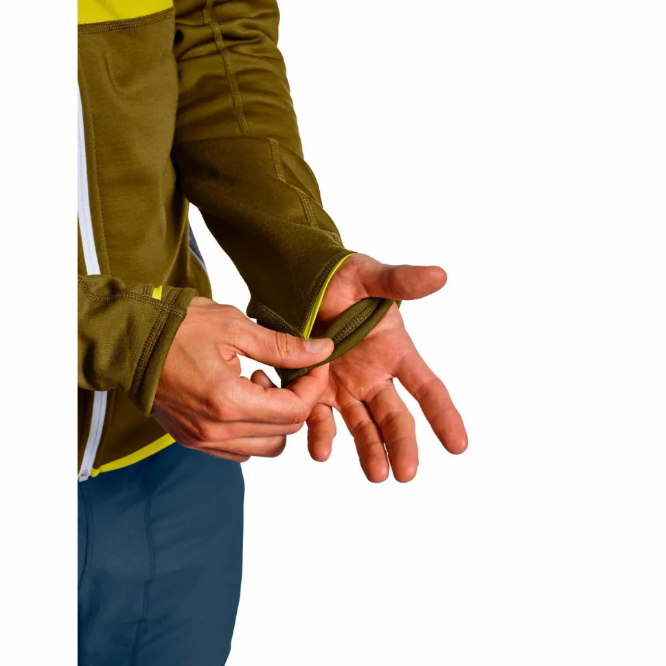 Die Outdoorjacke ist mit flexiblen Daumenschlaufen ausgestattet und besteht aus Merino Fleece von Ortovox. Bei diesem funktionalen Stoff wird recyceltes Polyester mit weicher Merinowolle aus tierfreundlicher Herstellung kombiniert. Das leichte Material ist atmungsaktiv, trocknet schnell und passt sich bei jeder Bewegung an den Oberkörper an. Die Wolle sorgt durch ihre Temperatur-regulierenden und geruchshemmenden Eigenschaften auf jeder Tour für hohen Tragekomfort.