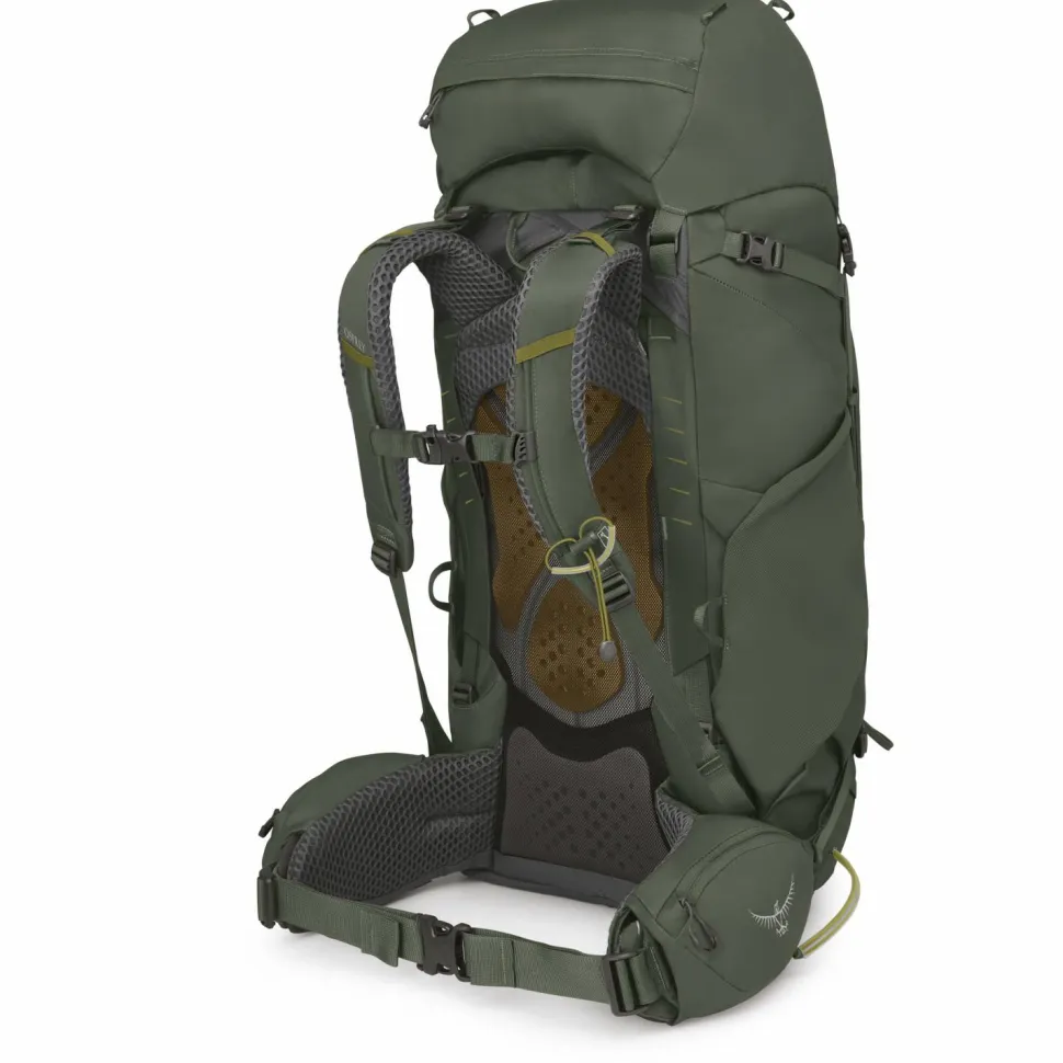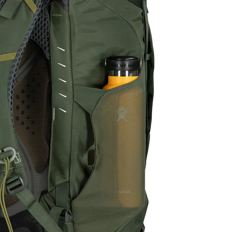Osprey fertigt den Trekkingrucksack als Toploader mit Deckelfach, Frontfach und seitlichen Fächer. Zusätzlich stehen diverse Kompressionsriemen, Befestigungsmöglichkeiten für Trekkingstöcke, sowie Daisychains und weitere Fixpunkte bereit. Das große Hauptfach lässt sich von oben, oder durch den langen Reißverschluss an der Seite erreichen. So lässt sich die Ausrüstung jederzeit bestens organisieren und verstauen.