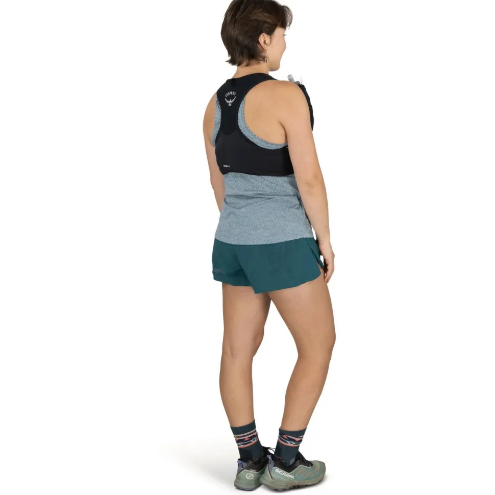 Die Osprey Women’s Dyna 6 LT ist eine leichte Laufweste für alle, die beim Training oder auf kurzen Trailruns bewusst minimalistisch unterwegs sein wollen. Statt Volumen aufzubauen, setzt sie auf eine westenähnliche Passform, die eng am Oberkörper anliegt und Bewegungen sauber mitmacht. Dadurch sitzt die Weste ruhig, ohne zu wackeln oder einzuengen – genau das, was Du bei schnellen Einheiten oder lockeren Trailläufen schätzt.