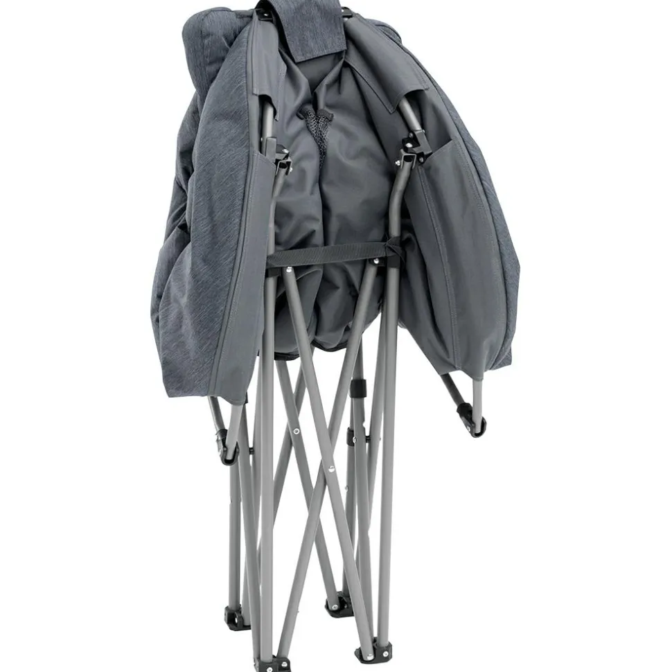 Der Kentucky Lake von Outwell ist ein gepolsterter Campingstuhl mit verstell- und abnehmbarer Kopfstütze. Der Bezug ist mehrlagig aufgebaut und besteht aus Polyestergewebe mit starker Polsterung. Ein pulverbeschichteter Stahlrahmen sorgt für Stabilität. Du kannst den Stuhl schnell auf- und zusammenklappen, er kommt ohne Montage aus und lässt sich mithilfe eines Klettbands kompakt verstauen.