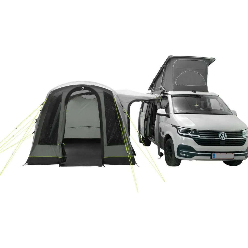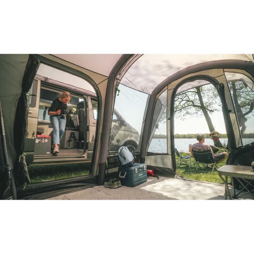 Ob Wochenendausflug oder längerer Campingtrip – dieses Busvorzelt bietet Dir einen hellen, gut nutzbaren Aufenthaltsbereich direkt am Campervan. Das Outtex 3000 Select Polyester mit 3000 mm Wassersäule schützt zuverlässig vor Regen, während große getönte Fenster viel Licht hineinlassen. Durch das solide Rigid Air System gelingt der Aufbau schnell und schafft eine stabile Struktur mit angenehmer Stehhöhe. So entsteht ein Raum, der Deinen Stellplatz sinnvoll erweitert, ohne viel Aufwand zu verursachen.