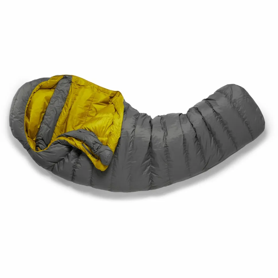 Gefüllt mit Entendaune und ausgestattet mit trapezförmiger Boxwall-Konstruktion, bietet der Schlafsack eine ausgezeichnete Wärmeleistung bei gleichzeitig guter Komprimierbarkeit. Die Außenhülle aus wasserabweisendem Pertex Quantum Pro schützt zuverlässig vor Feuchtigkeit und Kondenswasser im Zelt. Ein daunengefüllter Wärmekragen und eine durchgehende Reißverschlussabdeckung verhindern Kältebrücken und halten die Wärme dort, wo sie hingehört.