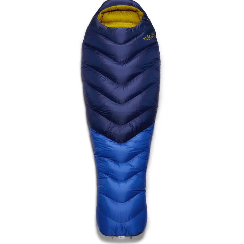 Der Neutrino 800 von Rab ist Deine zuverlässige mobile Schlafstatt für anspruchsvolle Touren bei Minusgraden. Mit 800 g hochwertiger Gänsedaune (800 cuin) bietet Dir der Schlafsack eine hervorragende Isolierung bei gleichzeitig geringem Gewicht und kompaktem Packmaß. Die Fischgrät-Kammernkonstruktion spart Material und stabilisiert die Daunen, während die trapezförmige Boxwall-Struktur ihre volle Bauschkraft entfaltet – für maximale Wärme ohne Kältebrücken.