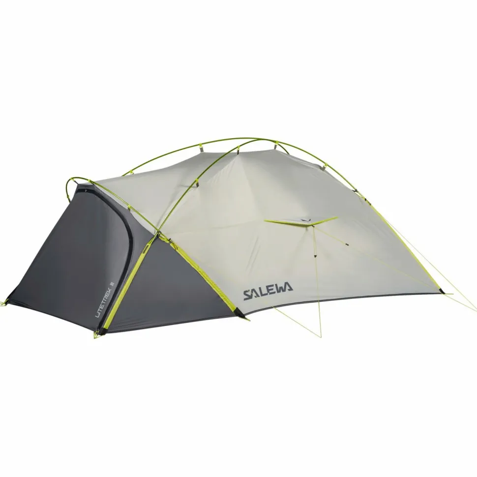 Das Litetrek III 3-Personenzelt bietet allerlei Platz für erholsamen Schlaf und trockenes Equipment. Zu dritt lässt es sich in Nullkommanix aufbauen und bietet viel Stauraum für das Gepäck in der Apside. Viele Features und das geringe Gewicht überzeugen bei häufigem Auf- und Abbau. Die ausgeklügelte Stangenkonstruktion hält das Zelt auch ohne Abspannung in Form. So lässt es sich auch an engen Stellen gut platzieren. Die Gestängebögen liegen zum größten Teil frei und können so mit Clips schnell fixiert werden. Wer schon einmal im Regen ein Zelt aufgebaut hat, wird wissen, wie viel das Wert ist. Der Boden im Eingangsbereich ist integriert und muss nicht separat eingehängt werden. So können dreckige Schuhe und das Equipment trocken gelagert und auch bei Regen entspannt gekocht werden. Super praktisch ist auch die Möglichkeit zur Erweiterung des Eingangsbereichs. Für eine gute Belüftung des 3-Personeneltes sorgt eine Ventilationsöffnung unterm Dach, die über Reißverschlüsse von innen und außen bedient werden können. Die spezielle Konstruktion der reflektierenden Abspannleinen sorgt für zusätzliche Stabilität bei windigen Wetterlagen. Zur Organisation der Abspannleinen beim Zusammenpacken des Zeltes dienen Kordelverschlüsse zur Fixierung. Die Leinen sind reflektierend, sodass man sie auch im Dunkeln gut sieht. Für den Fall der Fälle gibt Salewa ein Reparaturset dazu, um bei kleinen Rissen Schlimmeres zu verhindern. Das Litetrek III von Salewa ist ein komfortables Zelt für Naturfreunde und hält so manchem Unwetter ohne Probleme Stand