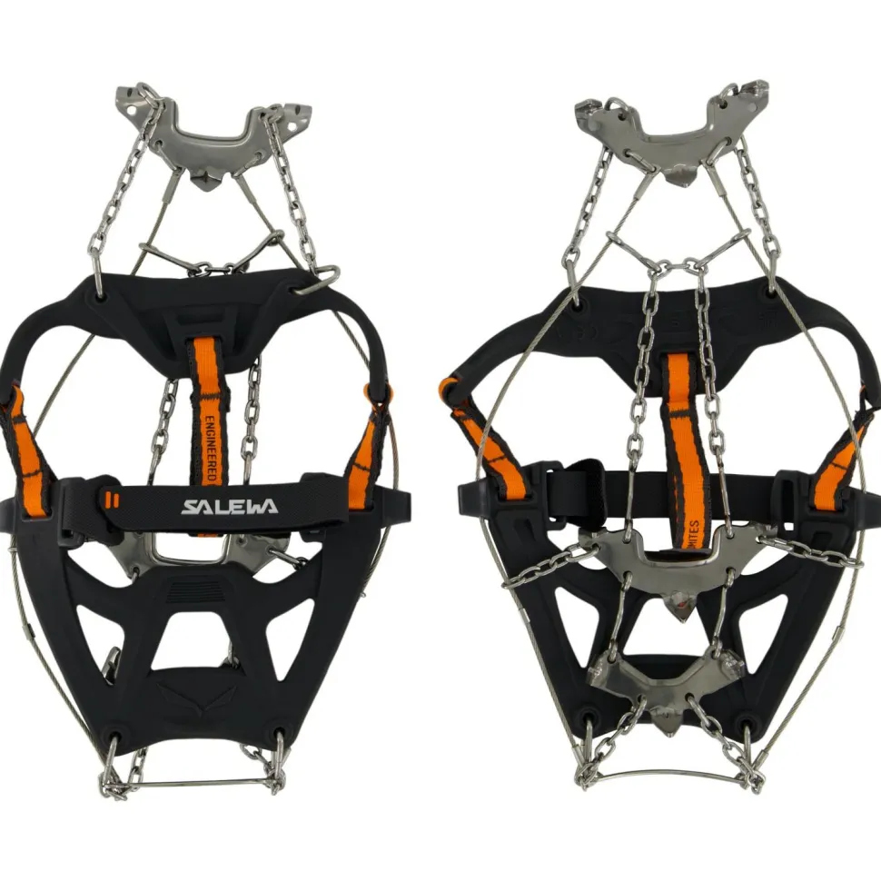 Die Pedroc Mountain Spike Crampons von Salewa kommen auf eisigen oder verschneiten Trails zum Einsatz: Die Konstruktion mit den neun bis zwölf Millimeter langen Spikes aus rostfreiem Stahl sorgen dabei für Halt auf glattem Untergrund. Die Spikes sind zudem durch leichte Stahlkabel und starke Ketten verbunden, um auch bei schnellen Bewegungen oder Drehungen Stabilität zu garantieren.