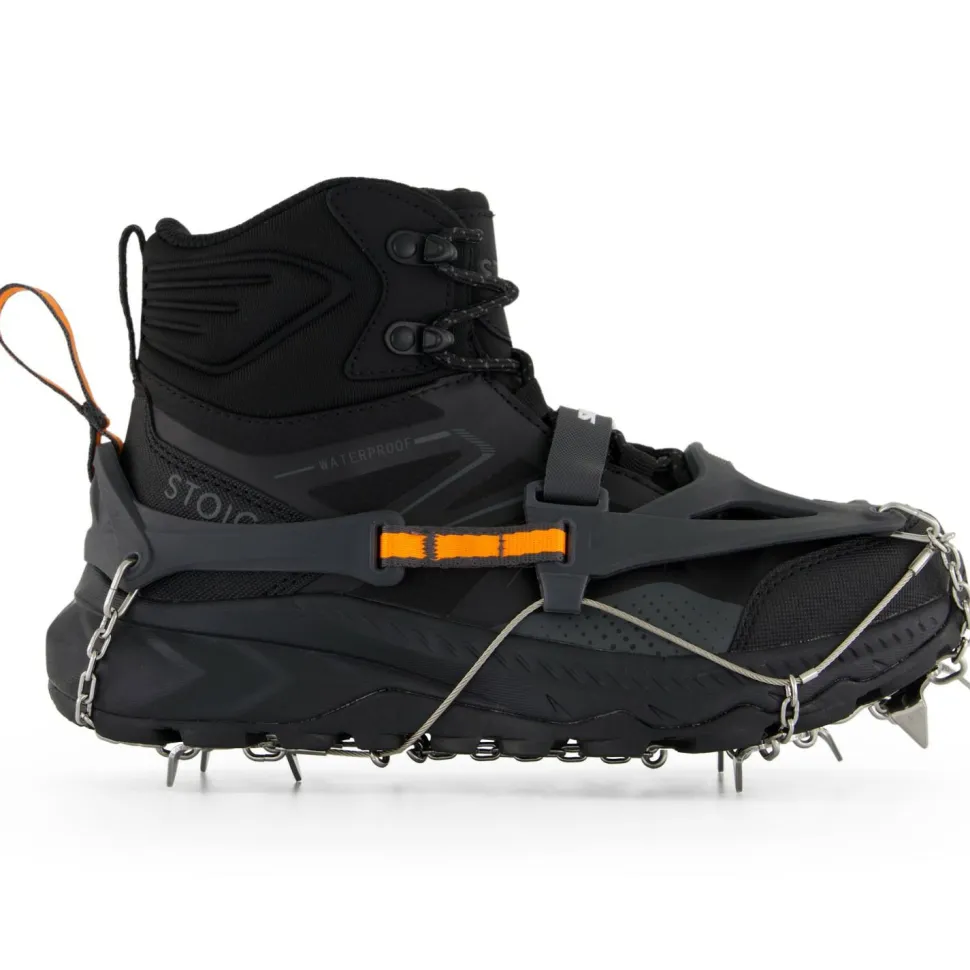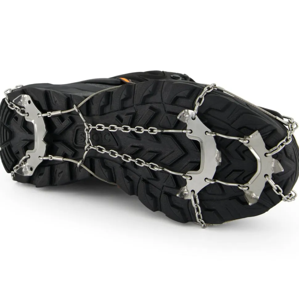 Der strapazierfähige Gurt ist mit einem Klettverschluss ausgestattet, der eine präzise Anpassung der Kabel im Vorder- und Mittelfußbereich ermöglicht und so eine gut umfassende Passform am Schuh gewährleistet. Dank der Anziehschlaufe an der Ferse lassen sich die Grödel schnell über- und abziehen.
