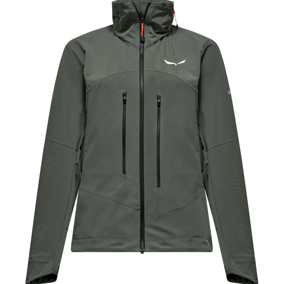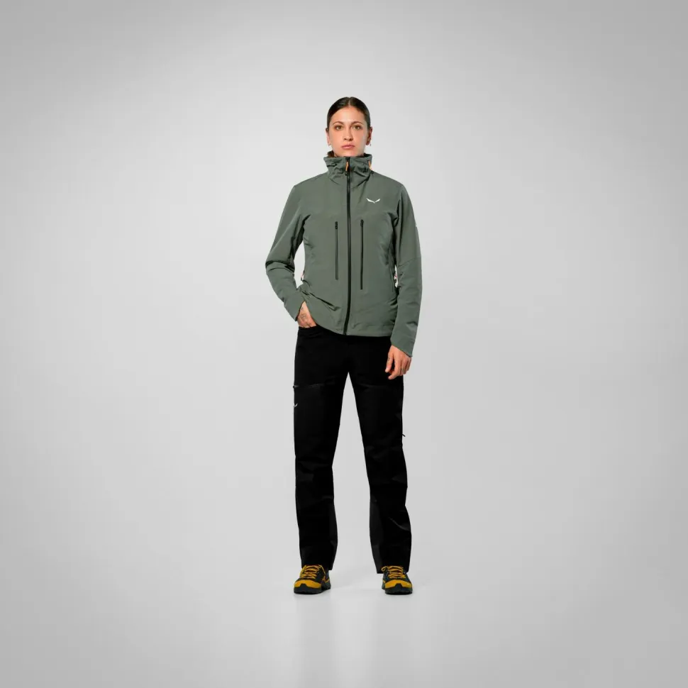 Die Women’s Ortles DST/SW Jacket Softshelljacke von Salewa liegt weich und bequem am Körper und bietet eine angenehme Luftzirkulation. Hierfür sorgen atmungsaktive Materialien und die Möglichkeit, mit zwei Unterarm-Reißverschlüssen manuell frische Luft ins Innere der Jacke zu befördern. Wind- und wasserabweisende Eigenschaften halten bei wechselhaftem Wetter die Elemente aus dem Inneren der Jacke fern, wodurch es hier trocken und gemütlich warm bleibt.