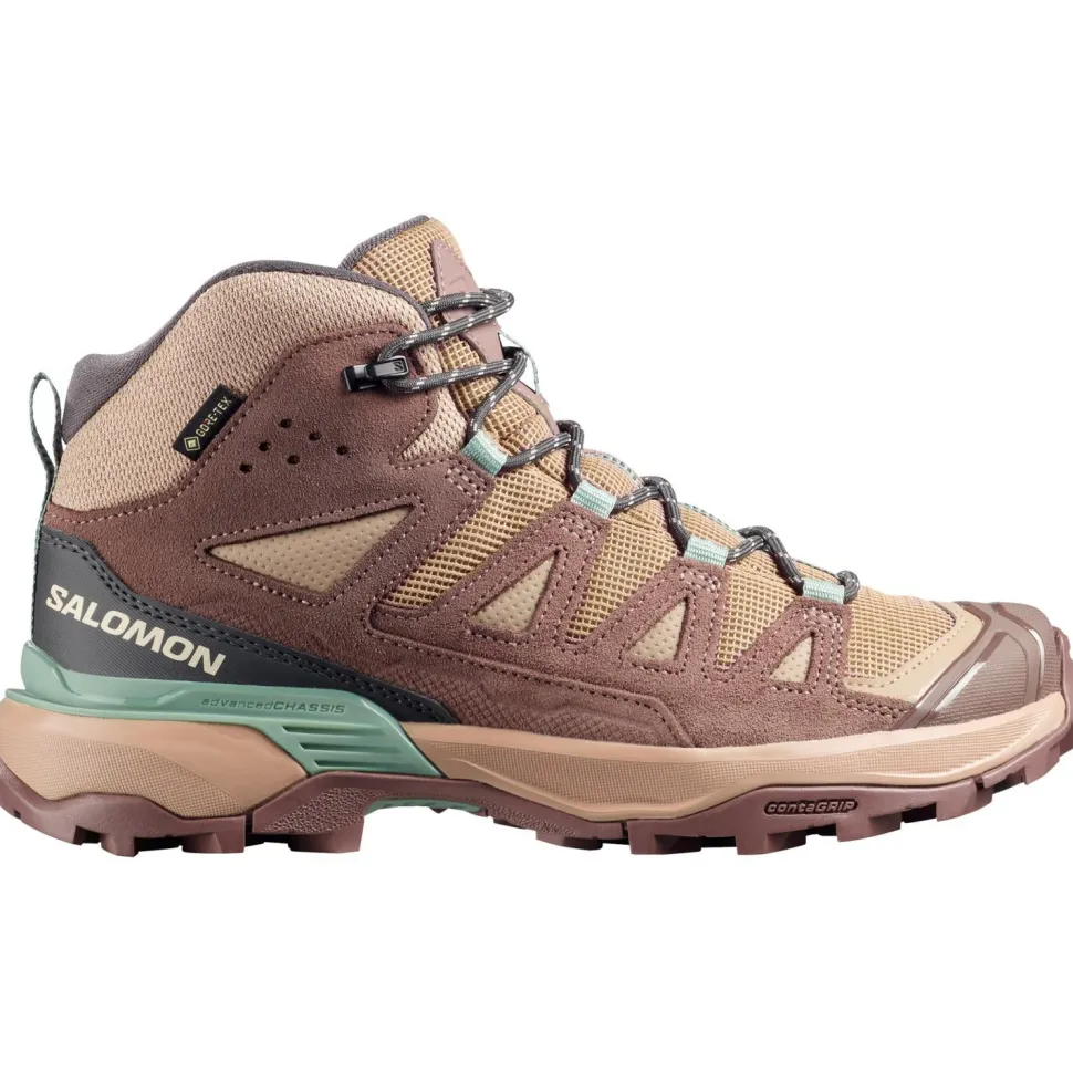 Der Wanderschuh Women’s X Ultra 360 Leather Mid GORE-TEX von Salomon ist griffig und stützend und eignet sich für längere Touren bei schwierigen Bedingungen.