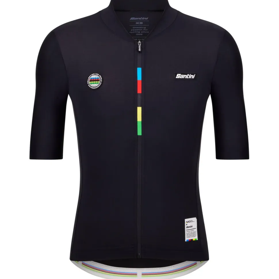 Das UCI World Champion Jersey Mondo Radtrikot von Santini ist körpernah geschnitten und begeistert durch aerodynamisch Design und tolle Beweglichkeit. Es verfügt über einen durchgehenden Frontreißverschluss, einen kurzen Stehkragen und natürlich drei praktische Rückentaschen für alle wichtigen Accessoires. Der weltmeisterliche Look mit Regenbogenfarben ergänzt das sportliche Design. Reflektierende Details und ein integrierter UV-Schutz mit UPF 50+ machen das sportliche Shirt komplett.