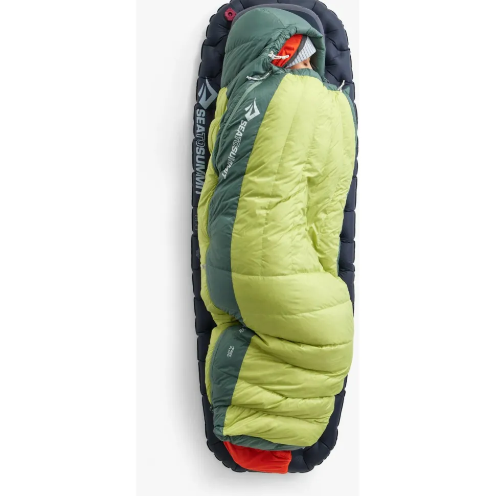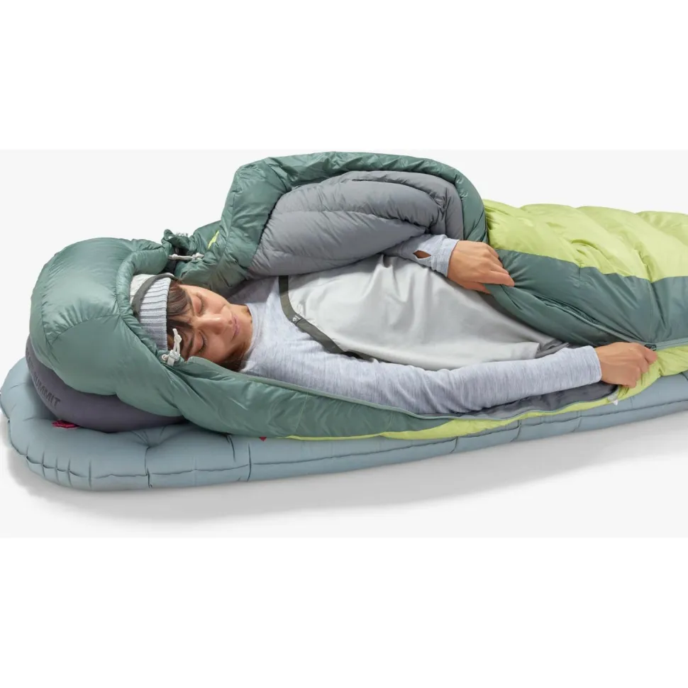 Mit dem Women’s Ascent -9°- Daunenschlafsack kommen die Outdoor-Spezialisten von Sea to Summit der vielbesungenen eierlegenden Wollmilchsau unter den Schlafsäcken ganz schön nahe! Mit einem unteren Limit von -15°Celsius und einer Komforttemperatur von -9°C eignet sich der Schlafsack sicher eher für den (mitteleuropäischen) Winter und insgesamt den kühleren Teil des Jahres. Er lässt sich aber auch als Decke nutzen, wenn die Witterung zu mild zu werden droht -das macht ihn sehr vielseitig einsetzbar. Der recht geräumige, frauenspezifische Mumien-Schnitt lässt Dich einerseits komfortabel schlafen, bietet andererseits aber auch stets genügend Isolationsleistung, damit Dir niemals frisch wird. In das Kapuzenteil des Schlafsacks passt außerdem ein Sea to Summit-Kissen (in der Größe Regular). Darüber hinaus ist der Women’s Ascent -9° mit anderen Schlafsäcken und Quilts von Sea to Summit koppelbar.