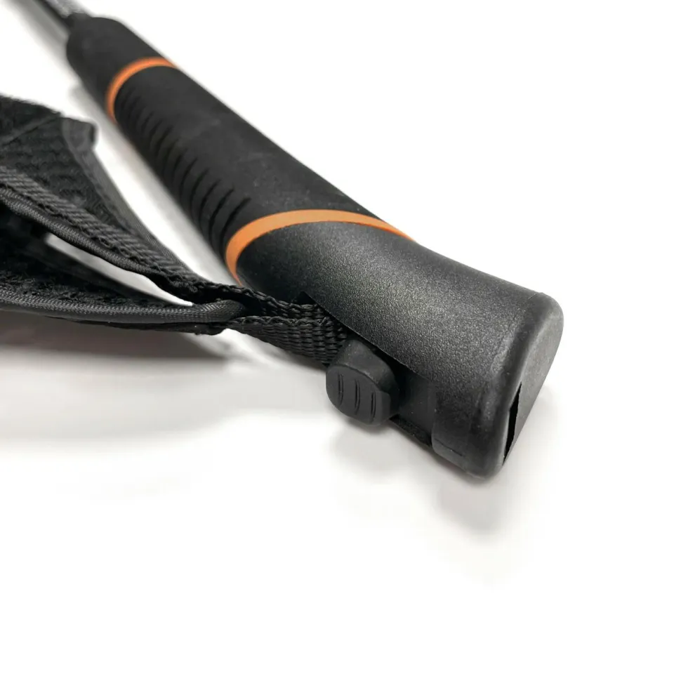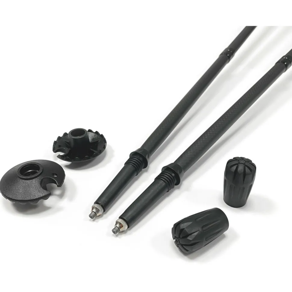 Die integrierten, per Schnellverschluss abnehmbaren Gelenk-Handschuhe sorgen mit ihrem atmungsaktiven Material für verschleißfreien Komfort und kommen in Größe S. Die verlängerten Griffe tragen ebenfalls dazu bei und sorgen für guten Halt in jedem Gelände. Als besonderes Detail der Running Carbon Trekkingstöcke sind die auswechselbaren, konkaven Hartmetallspitzen mit ihrem sicheren Halt hervorzuheben.