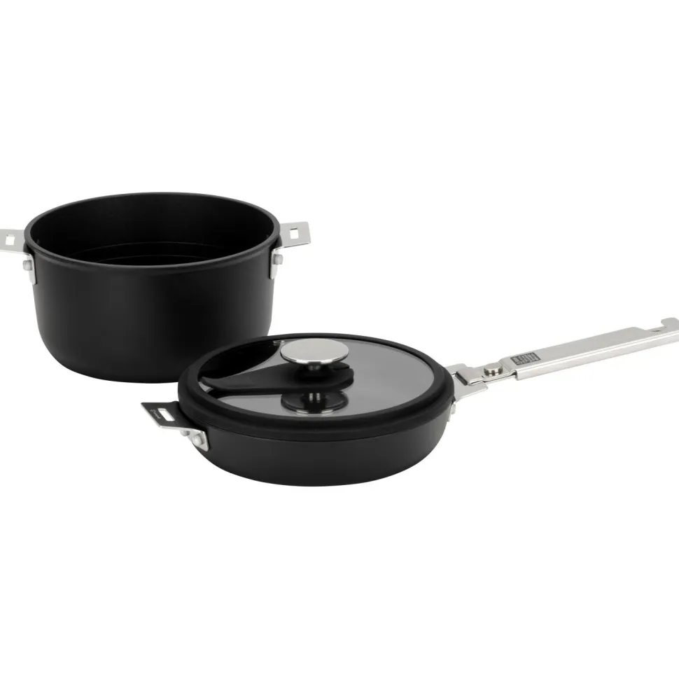 Ob zuhause oder beim Camping – das Home & Camp Cooker von Snow Peak lässt sich optimal auf Deine Kochbedürfnisse anpassen! Das zweiteilige Kochset aus Aluminium besteht aus einem Topf und einer Bratpfanne, die bei Bedarf kinderleicht zu einem Suppentopf oder einem Dutch Oven kombiniert werden können. Hinzu kommt ein praktischer Glasdeckel, sodass Du das Essen immer perfekt im Blick hast. Zum Verstauen und Transportieren können der Topf und die Pfanne platzsparend ineinander gelagert werden.