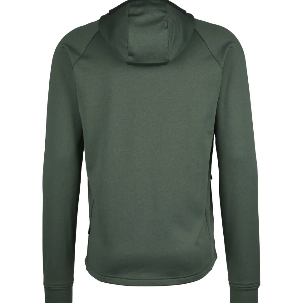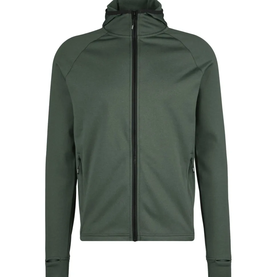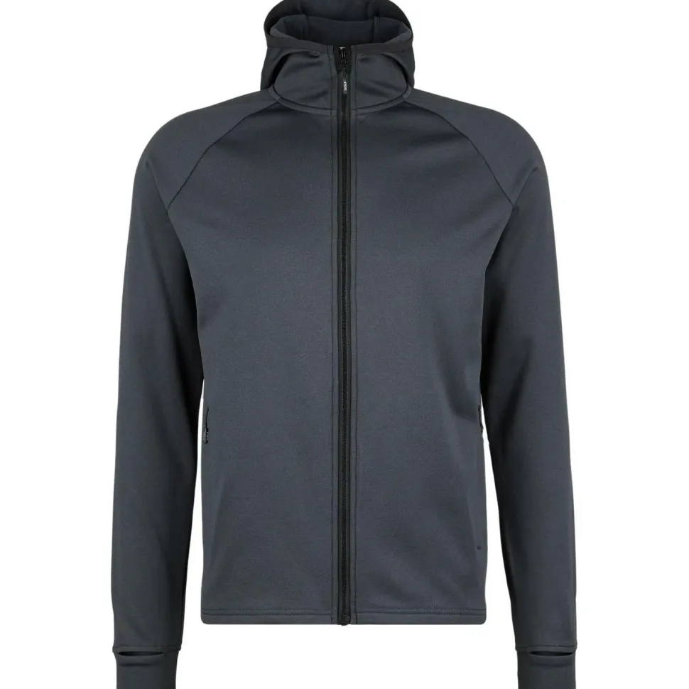 Für zusätzlichen Schutz vor Wind und Kälte sind eine elastisch eingefasste Kapuze und praktische Daumenschlaufen vorhanden. Zwei große Fronttaschen mit Reißverschluss bieten Platz für wichtige Kleinigkeiten, oder um die Hände darin warmzuhalten.