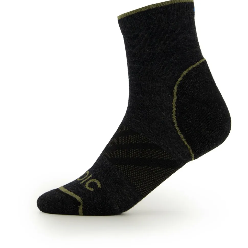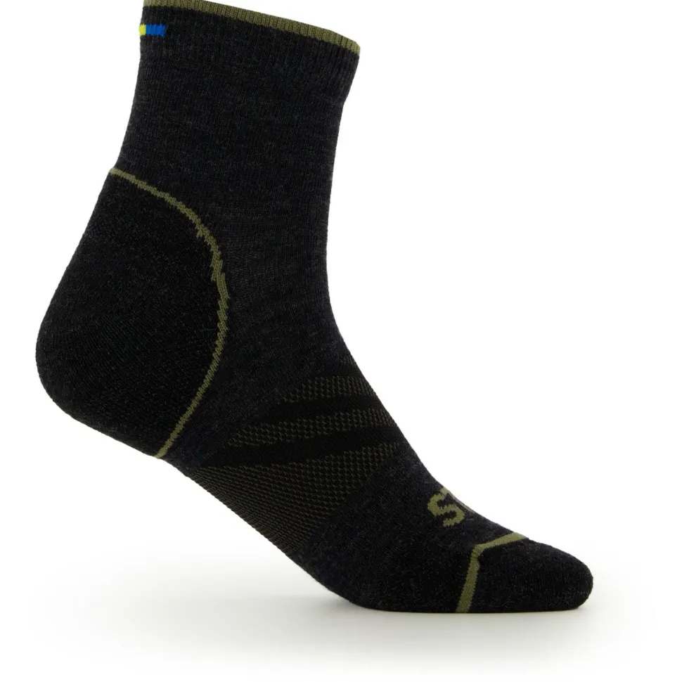 Die Merino Outdoor Quarter Socks Tech von Stoic bestehen zu einem Großteil aus Merinowolle. Diese mindert die Bildung unangenehmer Gerüche und ist daher ideal für Wandersocken geeignet. In Kombination mit den Polyamid- und Elasthanfasern werden die Socken zudem robust und behalten auch nach vielen Wäschen noch ihre ursprüngliche Form.
