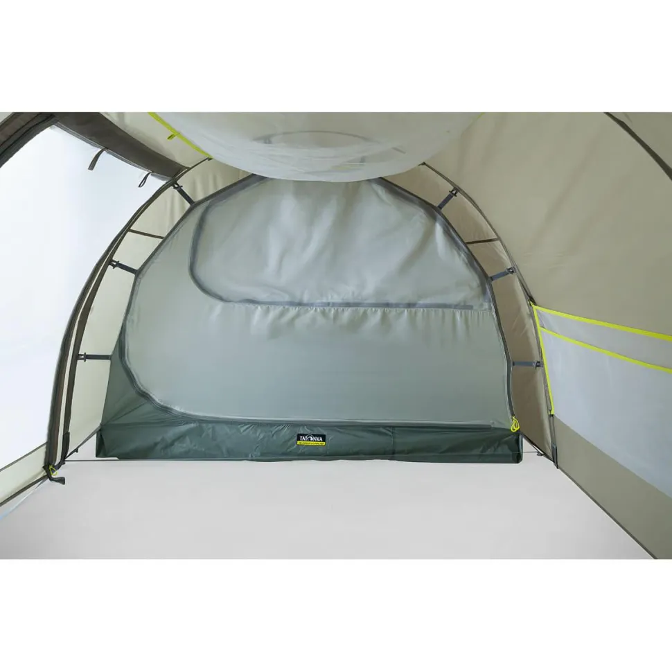 Zuverlässiges und komfortables Zelt für zwei Personen – das Alaska 2.235 PU von Tatonka ist ein geräumiges Tunnelzelt mit einer Apside. Es wird mit zwei Gestängebögen aus Aluminium aufgestellt. Insgesamt gibt es drei Eingänge im Außenzelt. Der seitliche Eingang in die Apsis kann durch ein separates Moskitonetz verschlossen werden, damit ungebetene Gäste keinen Weg in den Innenraum finden. Gleichzeit ist für eine angenehme Ventilation gesorgt, um das Zelt mit frischer Luft zu versorgen. Zwei zusätzliche Lüfter im Außenzelt, die sich von innen bedienen lassen, reduzieren das Entstehen von Kondenswasser auf der Innenseite.