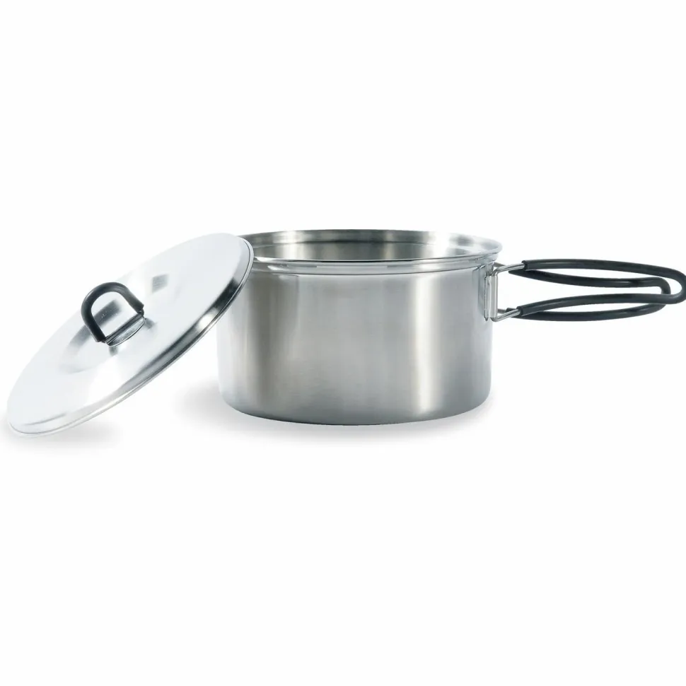 Outdoorköche und Köchinnen aufgepasst: das Cookset Regular von Tatonka bereichert die Campingküche! Das fünfteilige Edelstahl Kochset besteht aus einer Pfanne, einem 0,9 Liter Topf mit Deckel und einem 1,3 Liter Topf mit Deckel. Beide Töpfe und die Pfanne sind mit praktischen Klappgriffen versehen. Ineinander gepackt passt das Set platzsparend in den mitgelieferten Packbeutel.