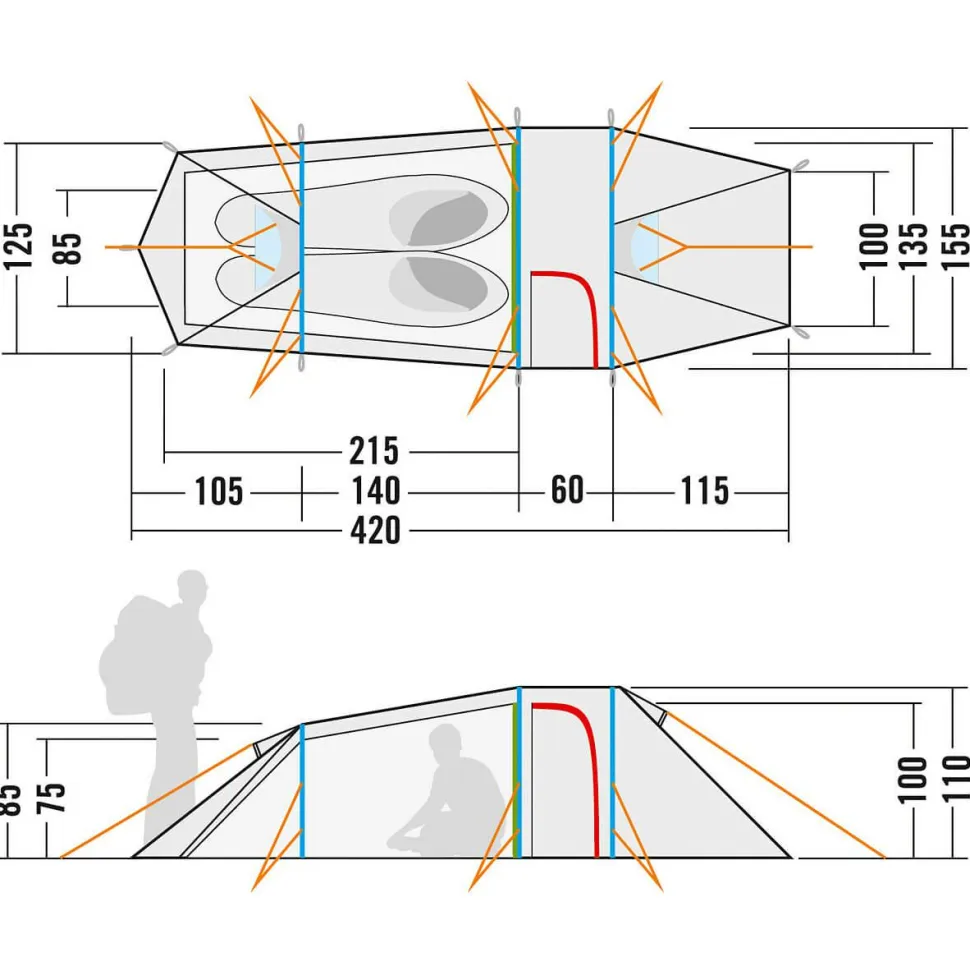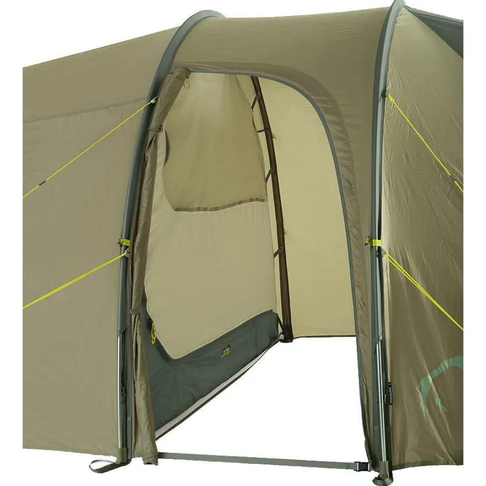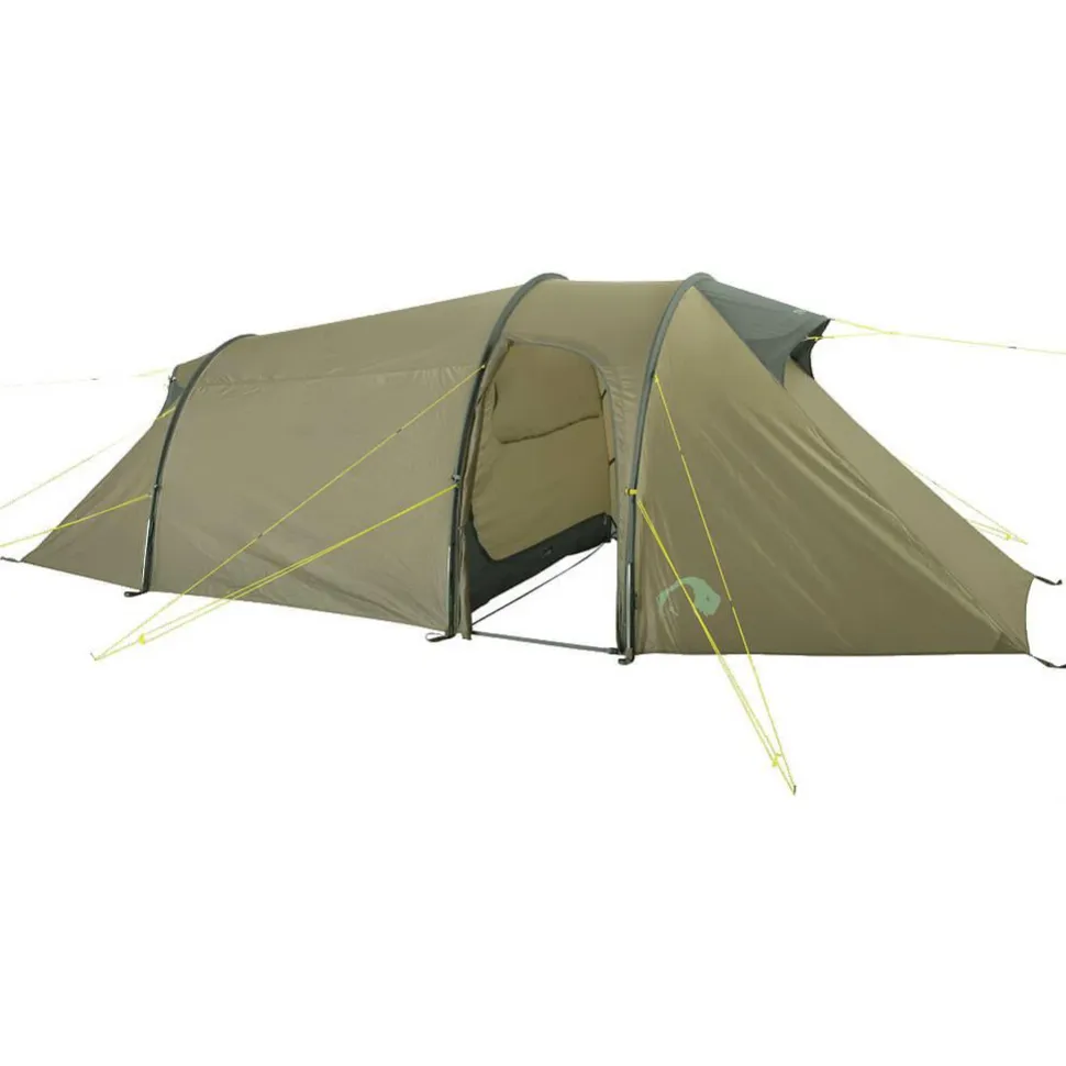 Die kleine 2-Zimmerwohnung für draußen: das Grönland 2 2-Personenzelt von Tatonka! Das robuste und windstabile Tunnelzelt besitzt eine besonders große Apside mit Seiteneingang, die einen eigenen Vorraum darstellt. Hier kommt jede Menge Gepäck problemlos unter und bei schlechtem Wetter kann man hier hervorragend kochen. Dass dieses üppige Platzangebot für nur 3,1 Kilogramm an Gewicht zu haben ist, liegt an der raffinierten Konstruktion und den hochwertigen Materialien, zu denen auch ein leichtes und bruchfest eloxiertes Aluminiumgestänge gehört.Die Gewebe sind robust, wasserabweisend und aufgrund der UV-Beständigkeit langlebig. Der Boden aus PU-beschichtetem Nylon hält mit 10.000 mm Wassersäule absolut dicht. Auch sämtliche Nähte des Grönland 2 sind wasserdicht versiegelt; Abdeckungen, Lüfter und Ansatzpunkte sind wasserdicht verarbeitet. Aufbau und Handhabung des Grönland 2 sind einfach, da das Innenzelt bereits eingehägt ist. Sollte es allerdings beim Abbau regnen, lässt sich das Innenzelt auch aushängen und trocken verstauen. Beim nächsten Aufbau wird dann zunächst das Außenzelt aufgestellt und anschließend das trockene Innenzelt eingehängt. Verstärkte Eckpunkte mit Gurtbandschlaufen sorgen während der Standzeit für Stabilität und erhöhen zusätzlich die Haltbarkeit.Im Innenraum sorgt eine integrierte Wäscheleine für trockene Socken und diverse Einstecktaschen helfen beim Ordnung halten. Für gute Ventilation sorgen zwei Lüfter am Außenzelt und Einer am Innenzelt. Ein gelungener Kompromiss aus Komfort, Kompaktheit und Leichtigkeit: das Grönland 2 von Tatonka!