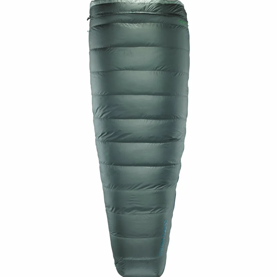 Wie eine Mischung aus Deckenschlafsack und Mumienschlafsack ist der Therm-a-Rest Schlafsack geschnitten. Er verzichtet auf eine extra Kapuze und kann bei Bedarf mit einem zweiten Schlafsack zu einem gemütlichen Doppelschlafsack für zwei Personen verbunden werden. Auch die Verwendung als warme Daunendecke ist möglich. Lediglich 640 g wiegt der Daunenschlafsack und lässt sich dabei kleiner komprimieren als ein Fußball. So lässt sich der Schlafsack mühelos und unbeschwert transportieren.