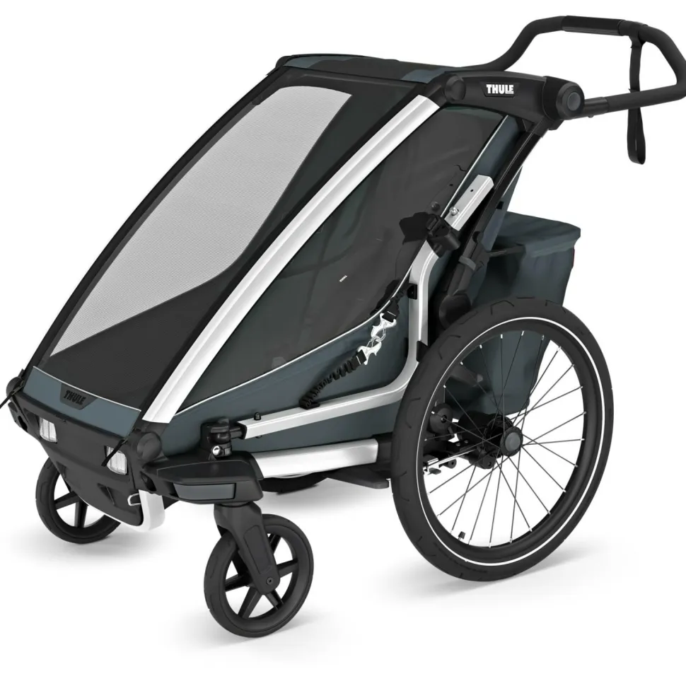 Viele Möglichkeiten und viel Platz für GepäckNeben den kleinen Passagieren findet auch das Gepäck seinen Platz. Eine geräumige hintere Gepäcktasche nimmt alles auf, was man unterwegs braucht. Die Tasche kann für mehr Beinfreiheit auch abgenommen und verstaut werden, wenn der Thule Chariot Cross 2 für eine Joggingrunde genutzt wird. Den Wechsel zwischen Radanhänger und Spaziergänger oder Jogger vollzieht man dank des im Lieferumfang enthaltenen Buggy-Sets schnell und einfach. Die beiden Systeme Thule Click n’ Store und Thule VersaWing machen das Ganze zu einer Sache von wenigen Handgriffen. Zudem ist der ergonomische Schiebebügel für den „Buggy Modus“ verstellbar, sodass er sich beim Gehen oder Joggen in optimaler Greifposition befindet.