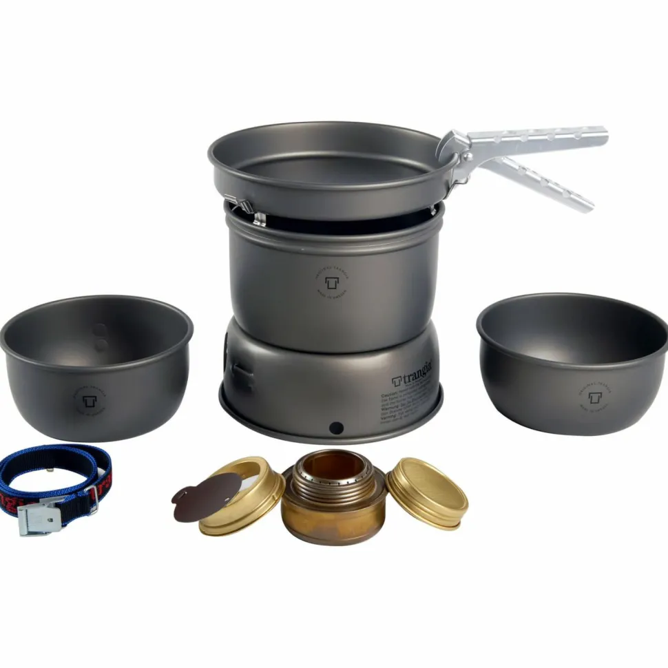 Die Kocherserie 27 Ultralight von Trangia umfaßt Kocher zum Bekochen von ein oder zwei Personen. Die Sets dieser kompakten Kocher fordern nur minimalen Platz im Rucksack und sind somit ideal für Touren, bei denen jedes Gramm zählt. Zudem ist es möglich, bei hochgeklappten Halterungen im oberen Windschutz, auch einen größeren Kochtopf zu verwenden. Die Sets gibt es außerdem in zwei Varianten: Ultralight Aluminium und Ultralight Hardanodized Aluminium.Der Trangia 27-1 besteht aus zwei 1 Liter Töpfen (einer mit und einer ohne Maßeinteilung), einer Bratpfanne (Ø 18 cm), oberem und unterem Windschutz, Spiritusbrenner, Zange und Riemen. Den Trangia 27-1 gibt’s auch mit einem Primus Gasbrenner anstatt des Spiritusbrenners!Die Variante Ultralight wird aus einer neuen Aluminiumlegierung hergestellt, die zu 50% stärker ist, als herkömmliches Aluminium. Das erlaubt den Bau von dünnwandigeren und damit leichteren Gefäßen. Deshalb punkten die neuen Trangia Modelle mit einem Gewichtsvorteil von bis zu 25% im Vergleich zu ihren Vorgängern!Ultralight Hardanodized ist eine ausgesprochen verschleißfeste Aluminiumlegierung. Durch Hartanodisierung erhöht sich die Kratz- und Verschleißfestigkeit, sowie die Korrossionsbeständigkeit. Diese Oberflächenbehandlung erleichtert zudem die Reinigung der Gefäße! Aufgrund seiner hervorragenden Eigenschaften ersetzt dieses Material sowohl die Titanium-, als auch die Duossal-Kocher.