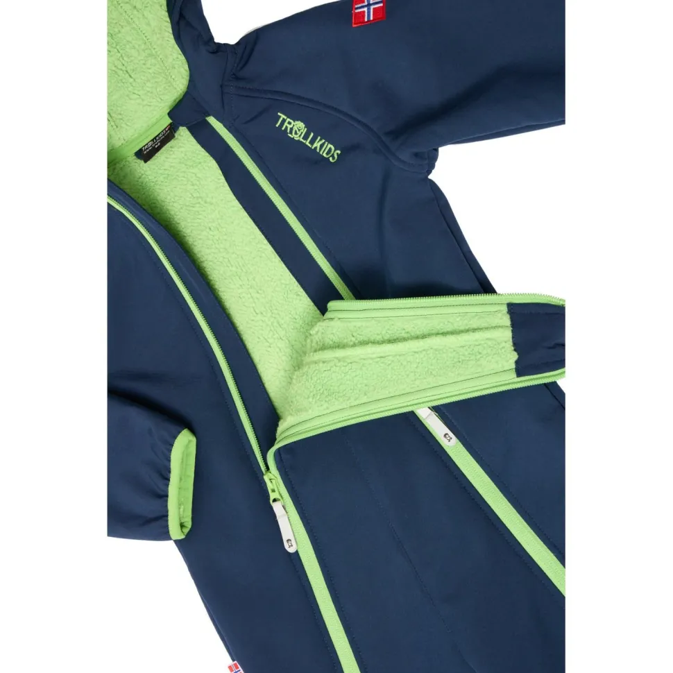 Mit dem Kid’s Nordkapp Overall von Trollkids starten kleine Wintersportfans ins weiße Gold! Der Overall ist aus einem stark wasserabweisenden, reiß- und abriebfesten Polyestergewebe gefertigt. Im Inneren sorgt ein kuschliges, hochbauschiges Teddy-Fleece Futter für herrlichen Komfort und effektive Isolation. Zwei Front-Reißverschlüsse erleichtern das Anziehen und die Beinabschlüsse sind mit praktischen Fuß-Schlaufen gegen ungewolltes Hochrutschen ausgestattet. Reflektierende Details auf dem Rücken erhöhen die Sichtbarkeit an dunklen Tagen.