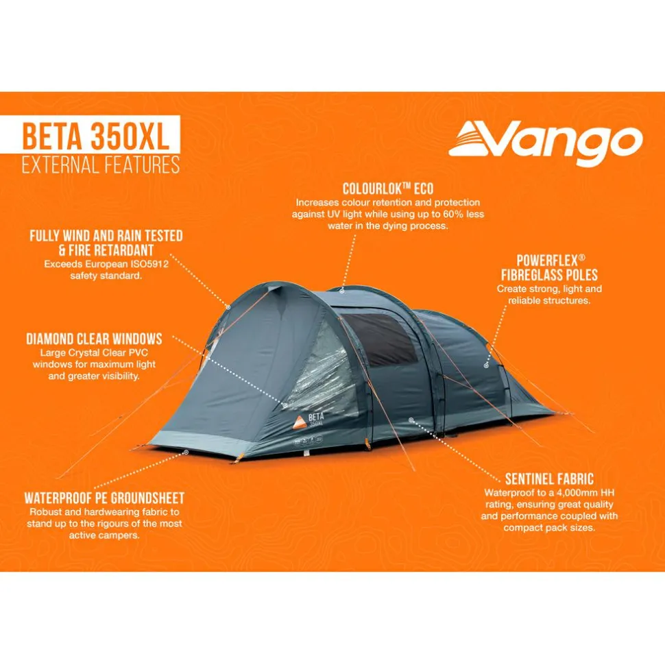 Das Beta 350XL ist ideal für Campingtrips mit dem Auto und wird auch Camper ansprechen, die ein geräumiges und komfortables Wochenendzelt suchen. Die Tunnelzeltkonstruktion ermöglicht einen schnellen und einfachen Aufbau, ohne Kompromisse beim Innenvolumen einzugehen. Die PowerFlex Glasfasermasten sind starke und leicht, und geben dem Zelt so eine zuverlässig-standfeste Struktur. Das Innenzelt aus strapazierfähigem Polyester und atmungsaktivem Mesh sorgt für eine gute Belüftung und reduziert die Kondensation.Deine Vorteile im Überblick: