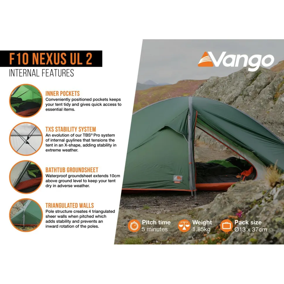 Wer solo oder zu zweit unterwegs ist, der ist mit dem 2-Personen-Zelt F10 Nexus UL 2 von Vango gut ausgestattet!