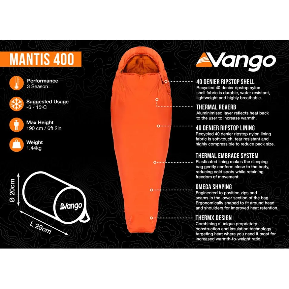 Der Mantis 400-Kunstfaserschlafsack von Vango bietet Dir optimalen Komfort und Wärme für Deine Outdoor-Abenteuer, und zwar das ganze Jahr über! Mit einem Gewicht von nur 1,44 kg und einem kompakten Packmaß ist er ideal für Trekkingtouren. Die ThermX-Technologie sorgt dafür, dass die Wärme genau dort bleibt, wo Du sie brauchst, ohne das Gewicht dabei nennenswert zu erhöhen. Das strapazierfähige Polair Eco Ripstop-Gewebe ist atmungsaktiv und wasserabweisend, sodass Du auch bei wechselhaftem Wetter gut geschützt bist.