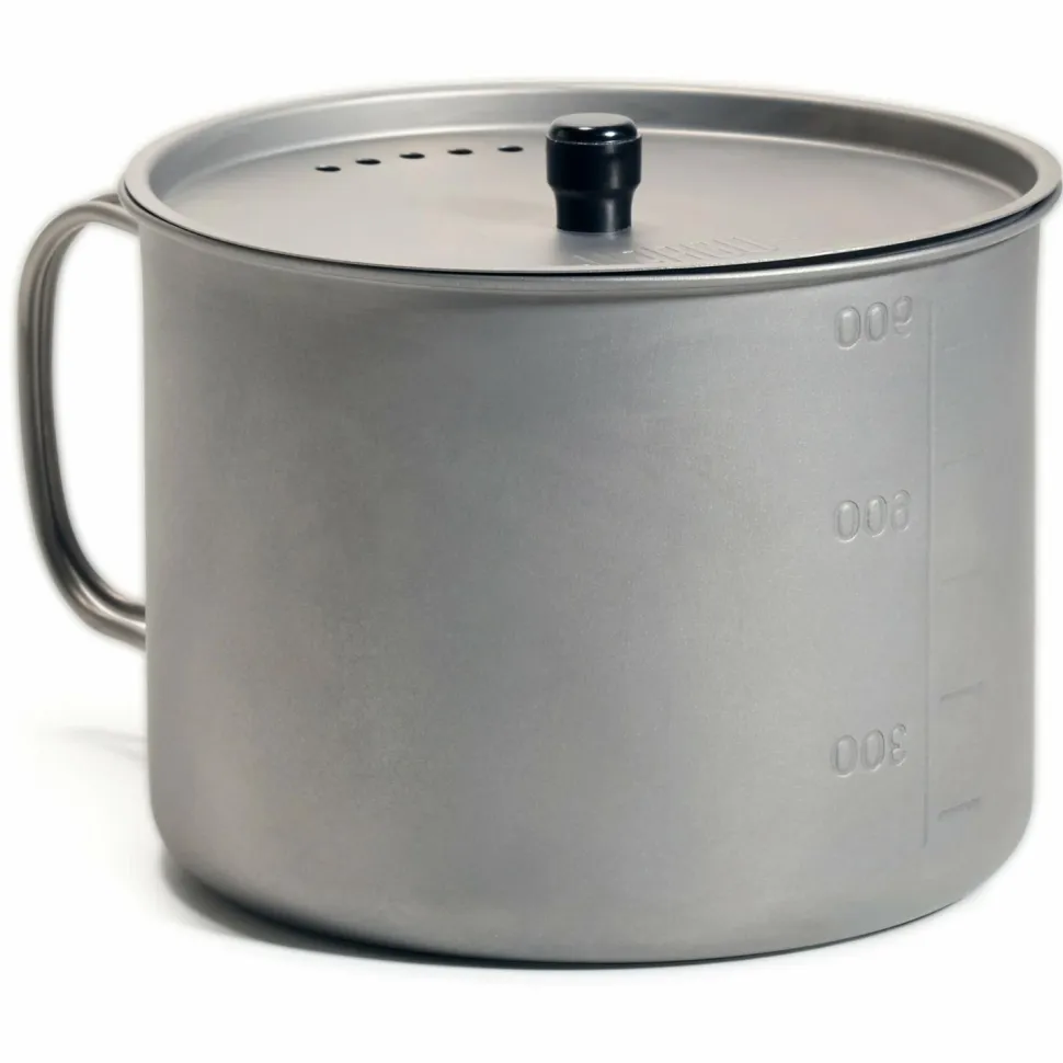 Der Ti-Lite Mug von Vargo fast 900 ml und ist aus Titan gefertigt. Dies macht ihn extrem leicht und robust. Der Deckel verfügt über kleine Löcher, über welche Flüssigkeit abgeleitet werden kann. Die Griffe sind für den platzsparenden Transport einklappbar. So kann der Topf sicher im mitgelieferten Beutel verstaut werden.