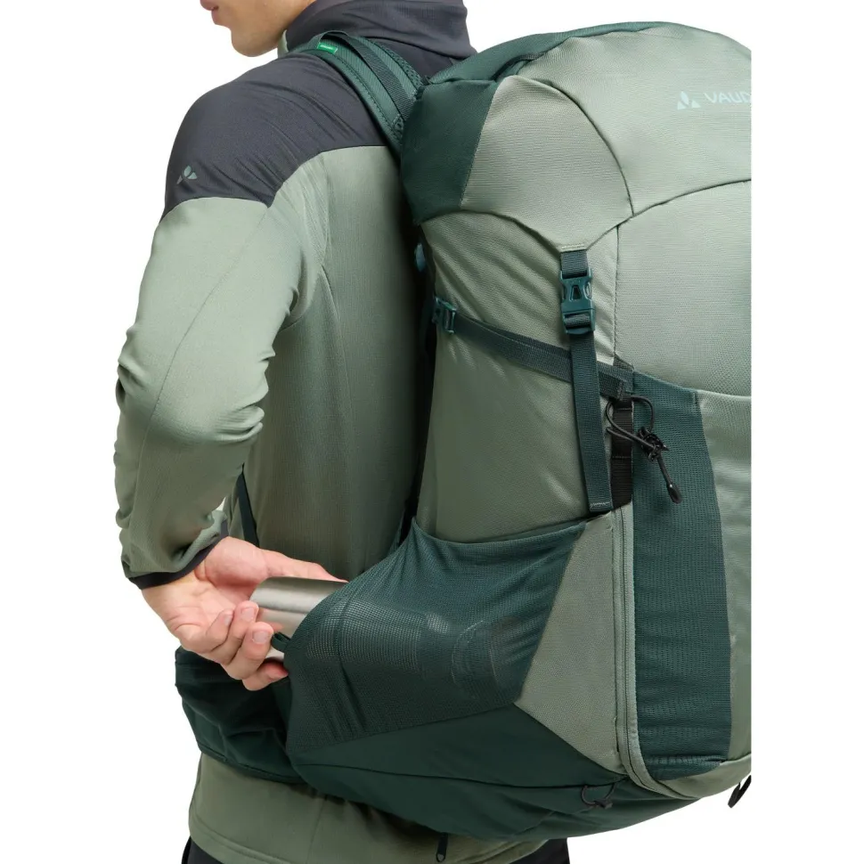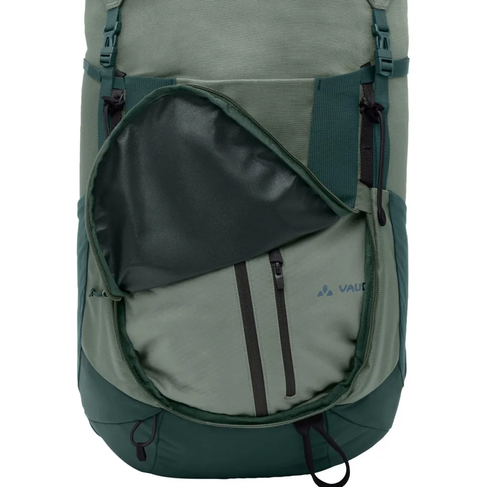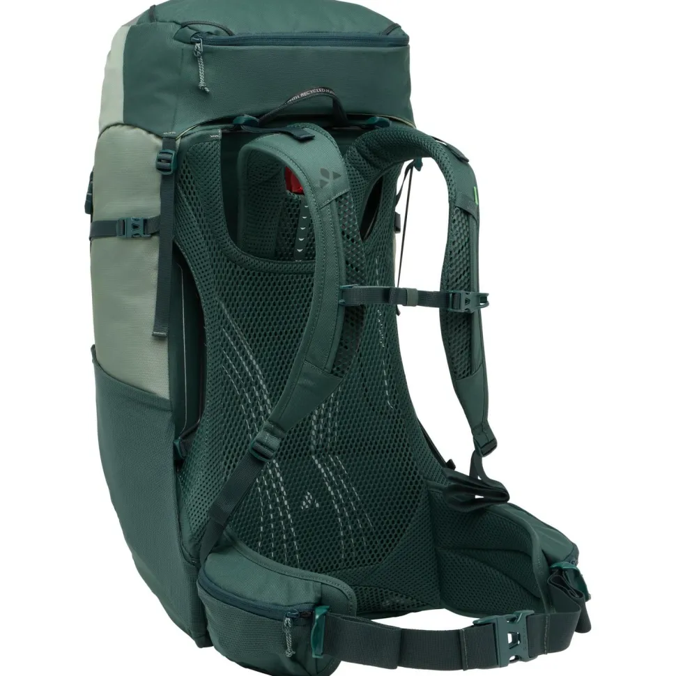Der Brenta 44+6 von Vaude ist ein sehr geräumiger und top ausgestatteter Wanderrucksack mit ausgezeichneter Rückenbelüftung. Sein individuell anpassbares Tragesystem wird ergänzt durch einen höhenverstellbaren Deckel, der mehr Volumen für Zusatzgepäck schafft. Die ErgoShape-Schultergurte verschaffen mehr Bewegungsfreiheit, während die gepolsterten Hüftflügel für Stabilität und Gleichgewicht sorgen. Schon auf den ersten Eindruck gefällt die praktische Fächeraufteilung und der schnelle Zugriff auf das Hauptfach, der auch per Reißverschluss möglich ist. Dadurch ist das Gepäck jederzeit sinnvoll aufgeteilt und schnell griffbereit.