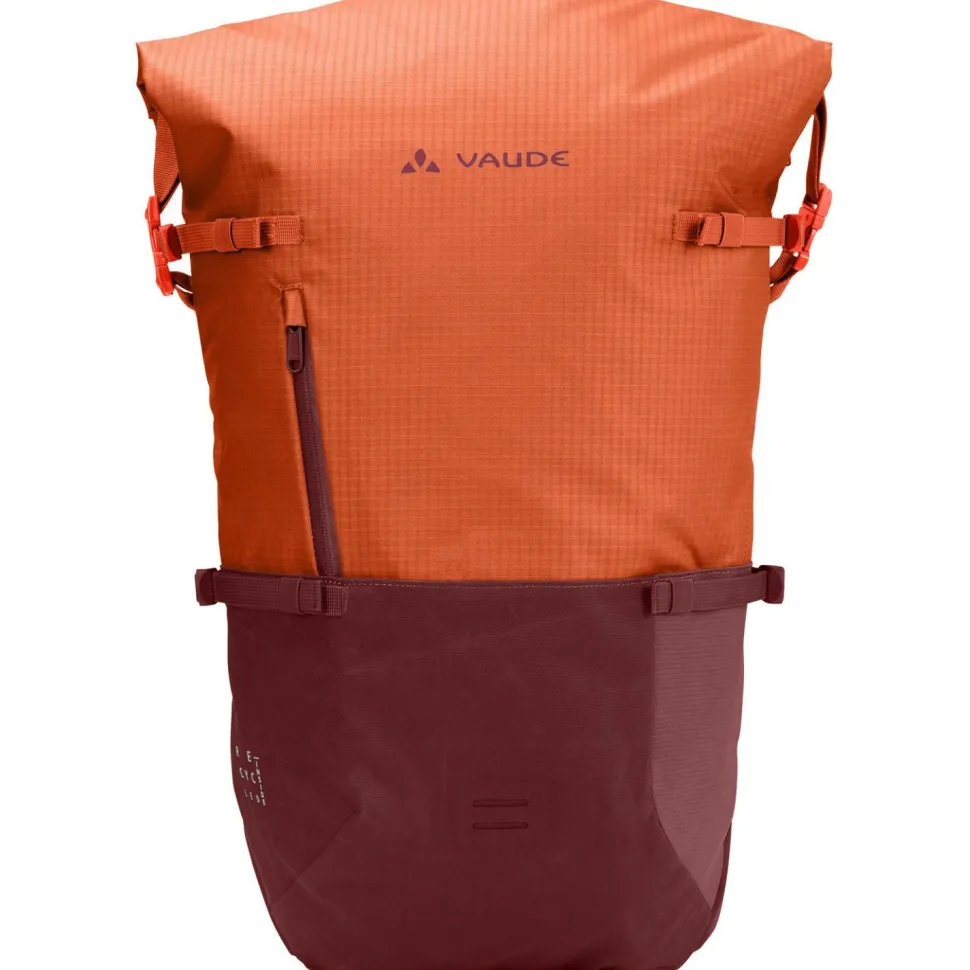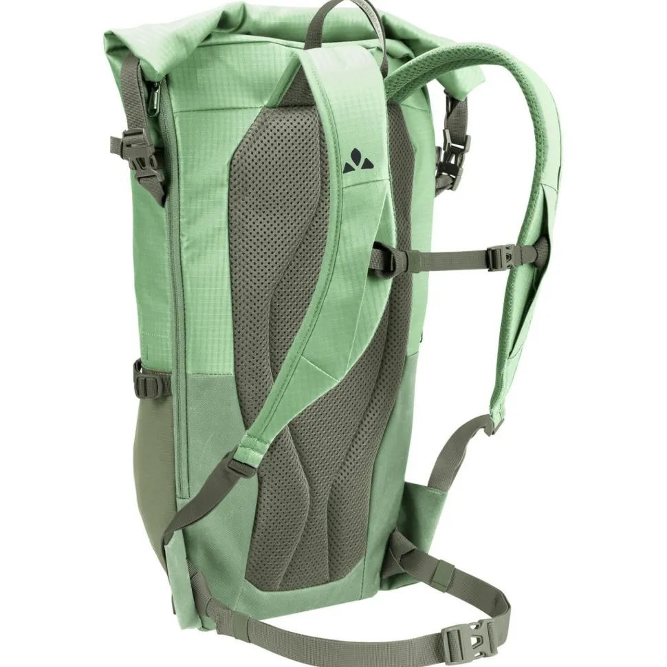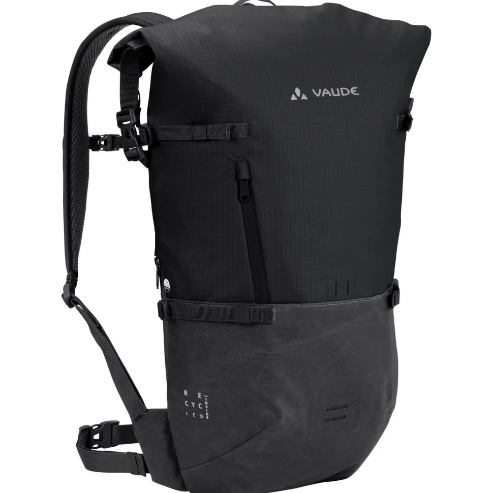 Der Citygo 23 II Daypack von Vaude bietet 23 Liter Stauraum, die bequem per Wickelverschluss verschlossen werden. Mit einer Kombination aus ergonomischen ErgoShape Schultergurten, Brustgurt und gepolstertem Vent Comfort Kontaktrücken trägt sich der schmal geschnittene Rucksack bequem im Alltag und in der Freizeit. Er ist mit einem 13,3“ großen Notebookfach ausgestattet und verfügt über eine seitliche Stretch-Tasche für Trinkflaschen, sowie einen Schlüsselhalter und eine Blinklichthalterung. Vaude fertigt den Rucksack fast vollständig aus recycelten Rohstoffen und macht den Citygo 23 II damit besonders umweltfreundlich.