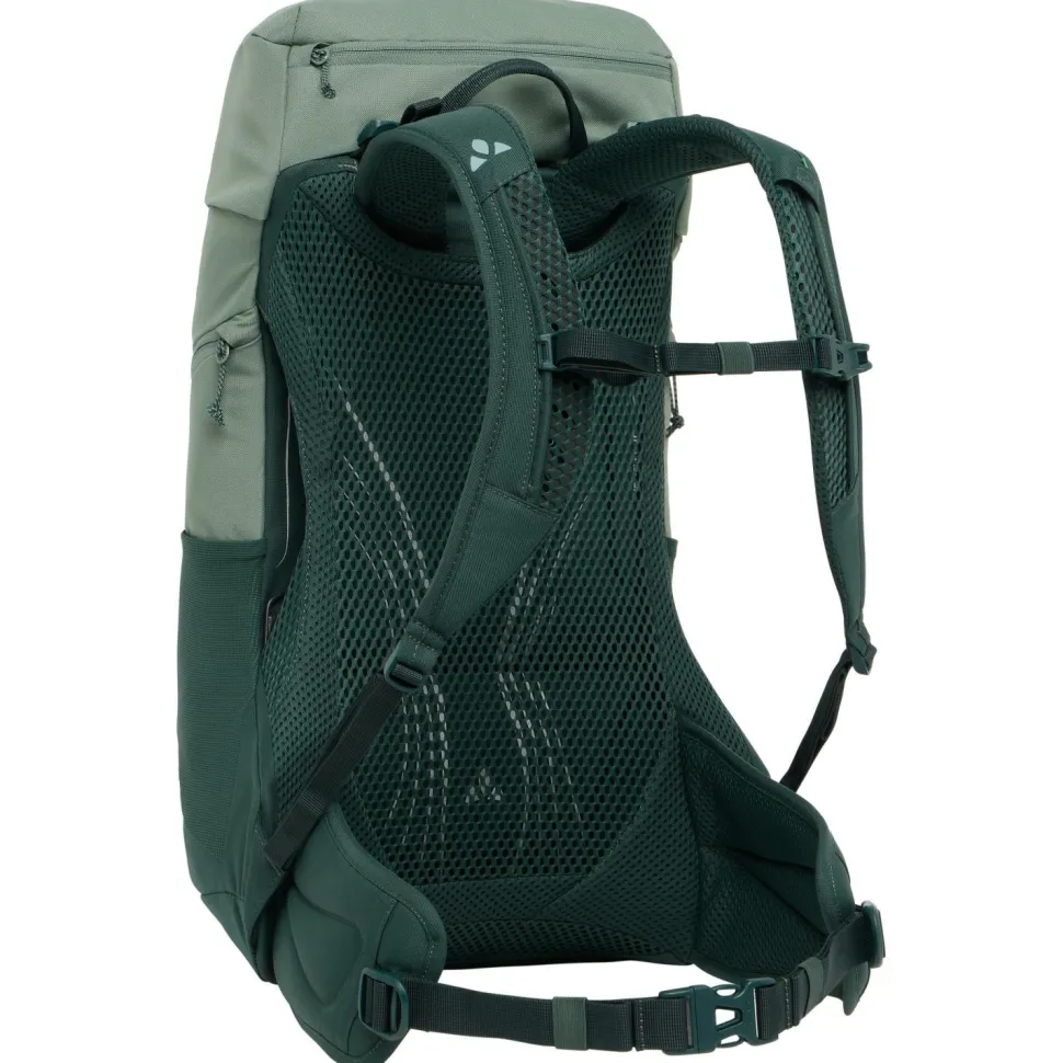 Der Jura 24 von Vaude ist ein kompakter und gut ausgestatteter Wanderrucksack aus ebenso funktionellem wie nachhaltigem Material! Sein von einem leichten Hüftgurt unterstütztes Aeroflex 3D 2.0 Tragesystem belüftet den Rücken permanent von allen vier Seiten und ist sowohl gegen Wärmestau als auch gegen Feuchtigkeitsbildung sehr wirksam. Die ergonomisch geformten Schultergurte tragen dazu die optimale Bewegungsfreiheit und noch mehr Komfort bei. Der zwischen ihnen liegende Brustgurt ist mit einem Trinkschlauchhalter versehen.