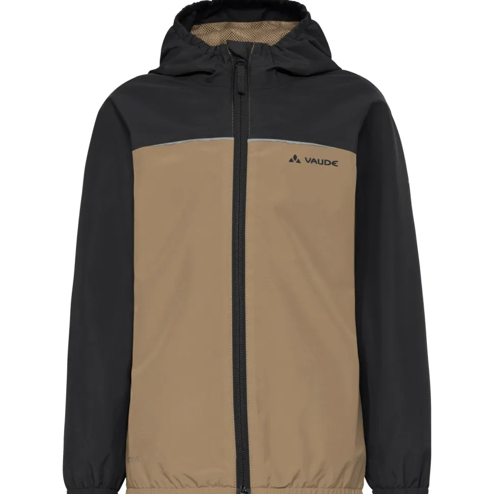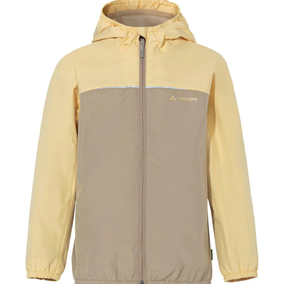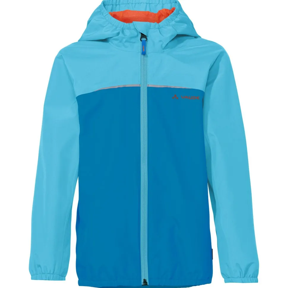 Die Vaude Regenjacke für Kinder ist mit reflektierenden Details ausgestattet und wird aus recycelten Rohstoffen gefertigt. Für zusätzlichen Nässeschutz sorgt eine wasserabweisende Eco Finish Behandlung an der Oberfläche. In den kleineren Größen (bis 122/128) ergänzt außerdem ein Namensschild die Regenjacke.