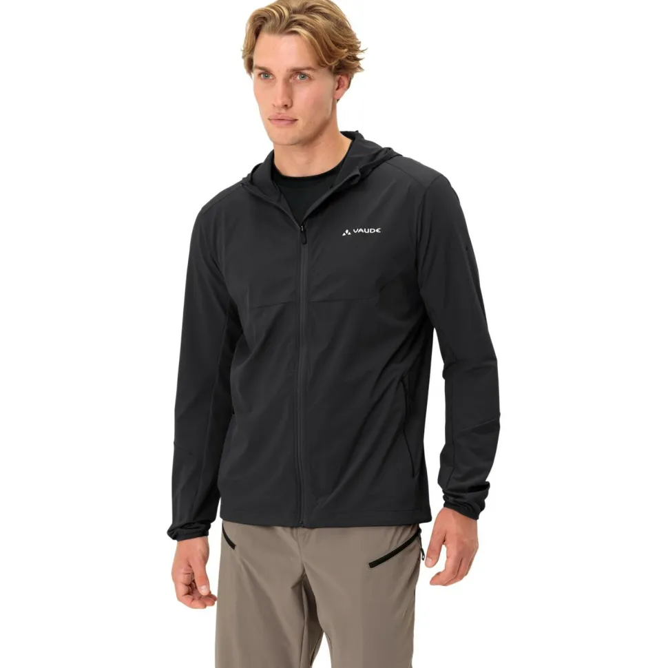 Die Moab Jacket IV Fahrradjacke von Vaude ist funktionell und ergonomisch perfekt auf die Bedürfnisse sportlicher Mountainbiker angepasst. Sie ist als wasserabweisende Softshelljacke konzipiert, die besonders atmungsaktiv ist und etwa 80% des Fahrtwindes abblockt. So sorgt das funktionelle Gewebe für gute Ventilation und transportiert die Feuchtigkeit vom Körper nach außen. Um die Ventilation noch zu verstärken können Mountainbiker die beiden Fronttaschen öffnen und damit einen zusätzlichen Luftdurchzug in der Bike-Jacke realisieren. Ebenfalls in den Taschen befinden sich die einstellbaren Kordelzüge, mit denen sich die Jacke am Saum individuell einstellen lässt. Für guten Windschutz am Hals und Kopf verfügt die Moab Jacket IV Fahrradjacke über einen hochgeschnittenen Kragen und eine wetterfeste Kapuze, die sich bei Bedarf auch platzsparend aufrollen lässt. Die Vaude Jacke ist mit ihrer strapazierfähigen Materialmischung aus Polyamid und Elasthan und den ergonomisch vorgeformten Ärmeln besonders bewegungsfreundlich.