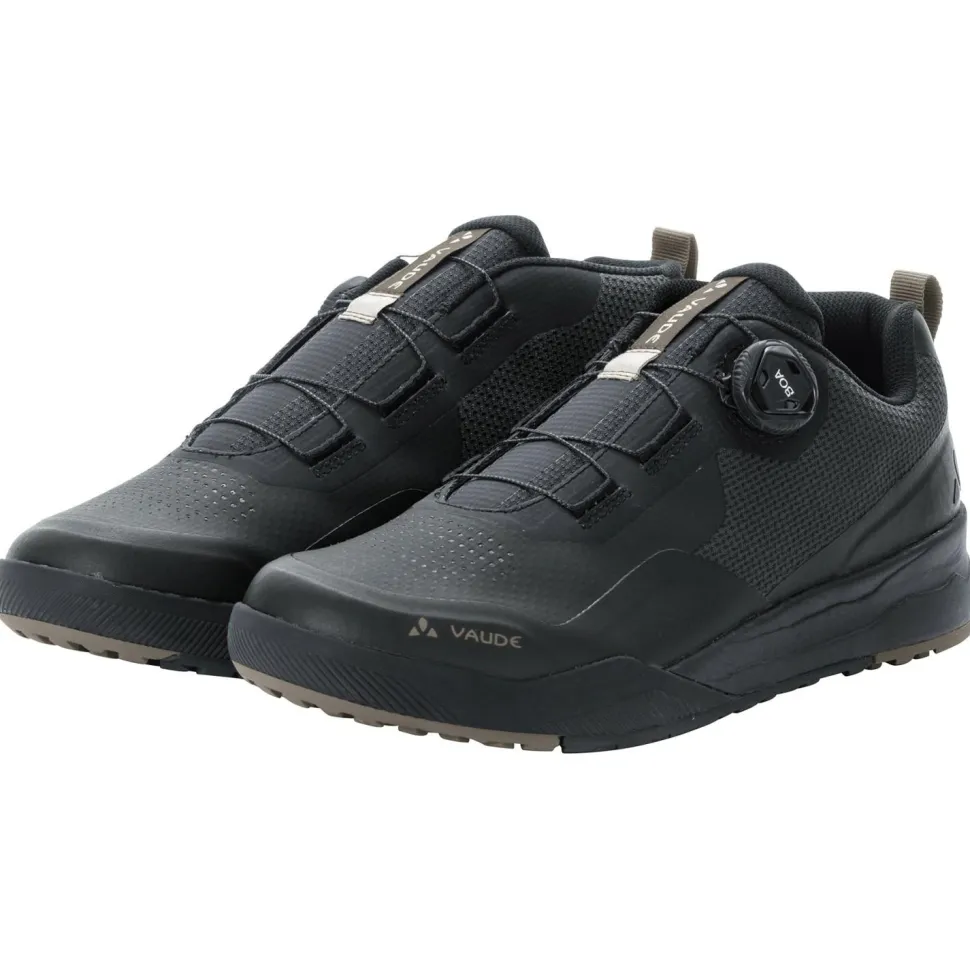 Vaude stattet die Moab Pro Tech Radschuhe mit einem effizienten BOA L6 Verschlusssystem aus. Der praktische Drehverschluss lässt sich schnell öffnen und schließen. Außerdem kann der MTB-Schuh auch während der Fahrt im Handumdrehen fester oder lockerer gedreht werden. Die sportlichen Schuhe bestehen größtenteils aus recyceltem Polyester und verfügen über eine wasserabweisende ECO Finish Behandlung, die zusätzlich gut vor Schmutz schützt.