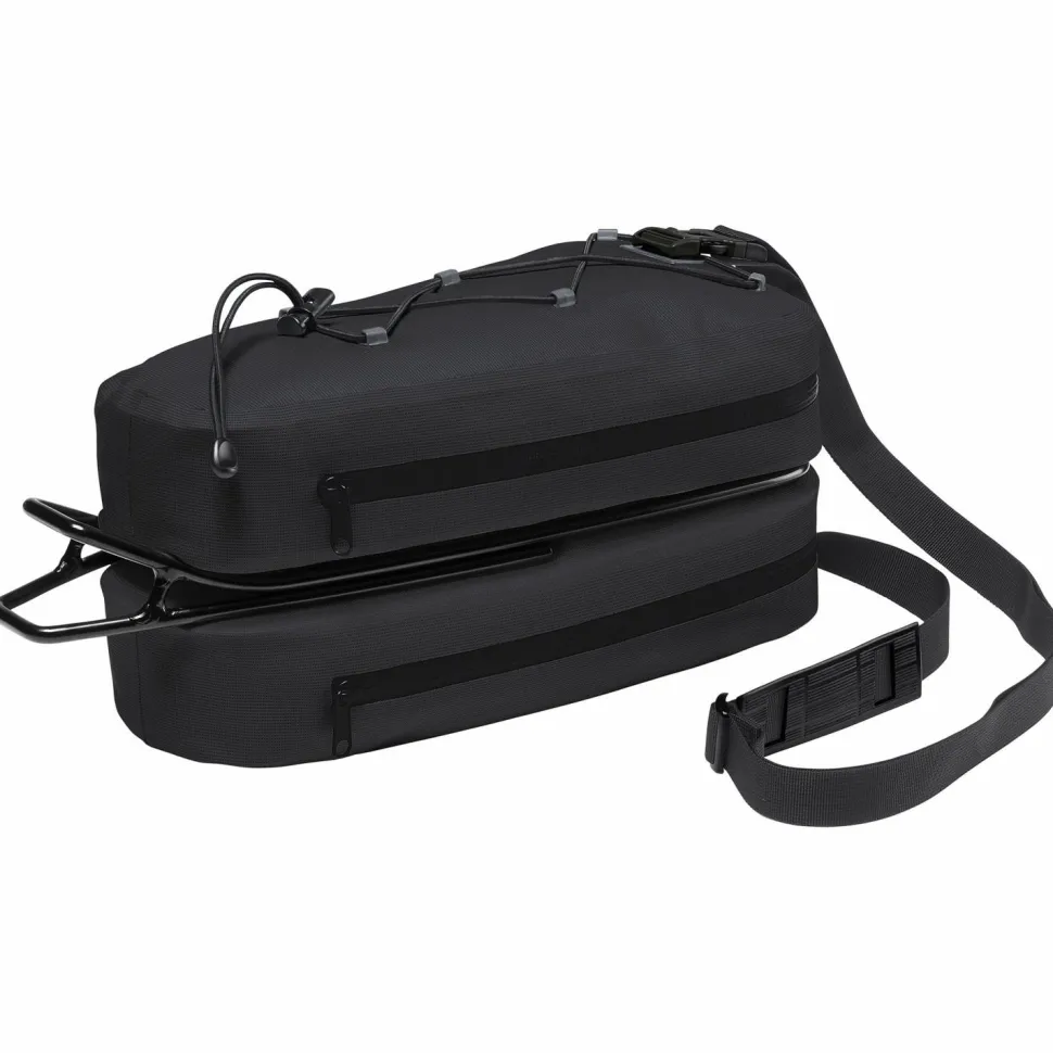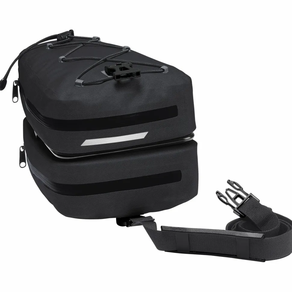 Proof steht bei Vaude für waterproof und Made in Germany! Die Fahrradsattelstützentasche bietet mit einer Beladbarkeit von bis zu 3 kg viel Platz und zusätzlichen Schutz gegen Spritzwasser und Schmutz. Es ist gelungen, den KLICKfix Contour Adapter so in die Konstruktion der Fahrradtasche einzubinden, dass zwei separate Fächer mit weit öffnenden, wasserdichten Reißverschlüssen übereinanderliegen. Dies ermöglich eine gute Organisation mit unten verstautem, schwererem Werkzeug und dem separaten Verstauen von Vesper oder Regenkleidung im oberen Fach. Abgerundet wird die Kompaktausstattung von einer auf dem Deckel befindlichen Kordelspinne, die das Verstauen von Windweste, Handschuhen oder einer Regenjacke sogar während der Fahrt möglich macht.