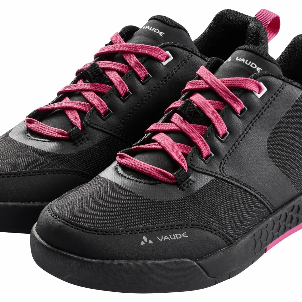 Robuste Schuhe für den Mountainbike Einsatz gesucht? Dann kommen die Women’s AM Moab syn. von Vaude gerade recht!Die Fahrradschuhe sind aus einem widerstandsfähigen, stark wasserabweisenden Canvas Oberschuh-Material gefertigt und werden durch externe Zehen- und Fersenschutzkappen nochmals verstärkt. Das Innenfutter ist aus teilweise recyceltem Polyester und sorgt zusammen mit der herausnehmbaren, ergonomisch geformten Einlegesohle für angenehmen Komfort auch auf langen Touren. Die Vaude AM Flat Sohle aus der abriebfesten SUPtraction Gummimischung ist mit ihrer erhöhten Auflagefläche auf den Flatpedal-Einsatz ausgelegt. Im Pedalbereich sorgt das hexagonförmige Profil für idealen Grip und auf dem Boden für sicheren Tritt auch in schwierigem Gelände. Eine dämpfende EVA-Mittelsohle dient als stoßabsorbierendes Element und sorgt für gelenkschonende Touren.