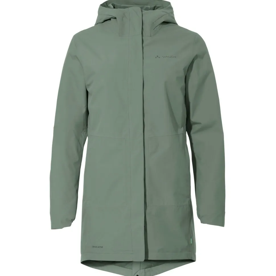 Schön lang geschnitten und mit femininer Linie zeigt sich der Women’s Cyclist Padded Parka II von Vaude!