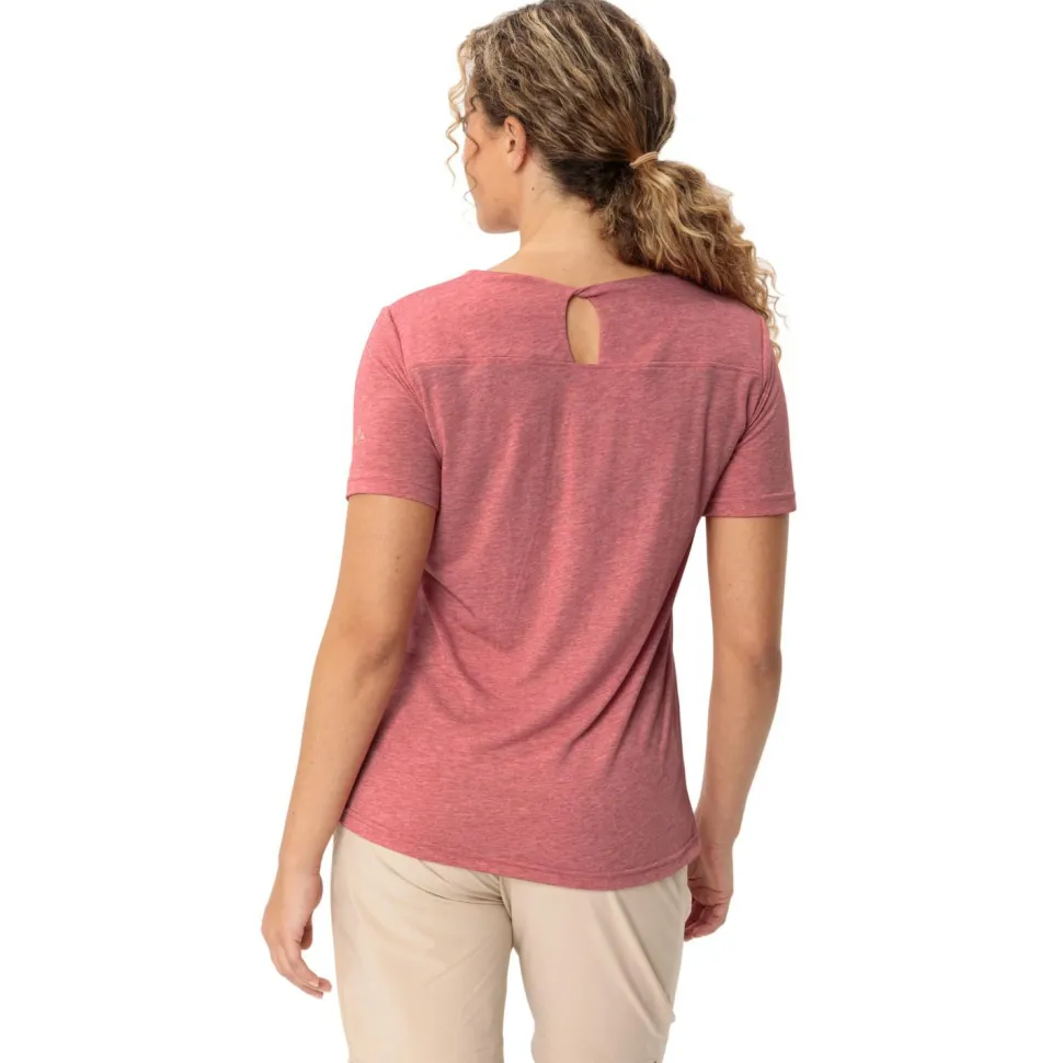 Das Women’s Skomer Hiking T-Shirt II von Vaude ist ein feminines, detailreiches Funktionsshirt zum Wandern und für den Alltag. Sein Hauptmaterial besteht aus recyceltem Polyester mit einem 20-prozentigen Anteil Lyocell. Letzteres ist eine Zellulosefaser, die aus geprüft nachhaltigem Holz gewonnen wird. Diese vollständig biologisch abbaubaren Fasern tragen sich seidenweich, haben feuchtigkeitsregulierende Eigenschaften und sorgen für ein angenehm kühles Tragegefühl. Dank des Zusammenspiels mit den Kunstfasern ist das Gewebe des Skomer Hiking T-Shirts außerdem schnelltrocknend und geruchshemmend.