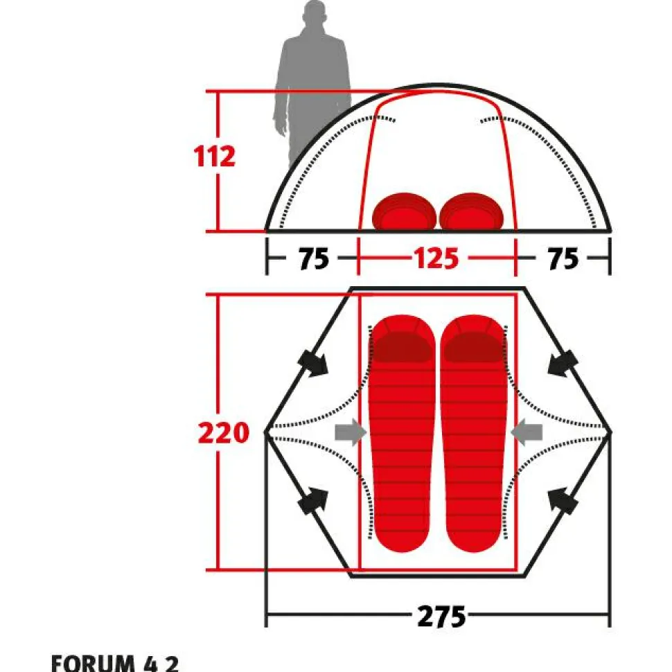 Neben hohem Komfort und Vielseitigkeit gehört die enorme Stabilität zu den Stärken des Zelts. Als Teil der Unlimited Serie ist das Forum für sehr fordernde Unternehmungen wie Wintertouren oder Expeditionen konzipiert. Das zeigt sich nicht nur am hochgradig robusten, mit hochwertigen Beschichtungen behandelten Material, sondern auch an Konstruktionsdetails wie dem weit nach unten gezogenen Außenzelt. Die umfassende Ausstattung mit solchen besonderen Details ist ein weiteres auffallendes Merkmal des Forum 42. Dazu gehören die vier Eingänge am Außenzelt, die beim Öffnen mit nach oben gezogen werden und somit nicht herumflattern und verschmutzen. Oder die verschließbaren Lüfter am Außen- und Innenzelt. Oder die gegen Zugluft abdeckbaren Moskitonetz-Türen am Innenzelt.