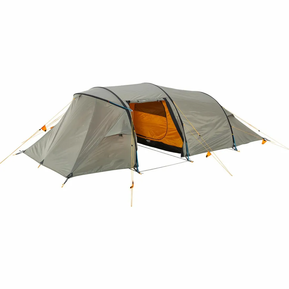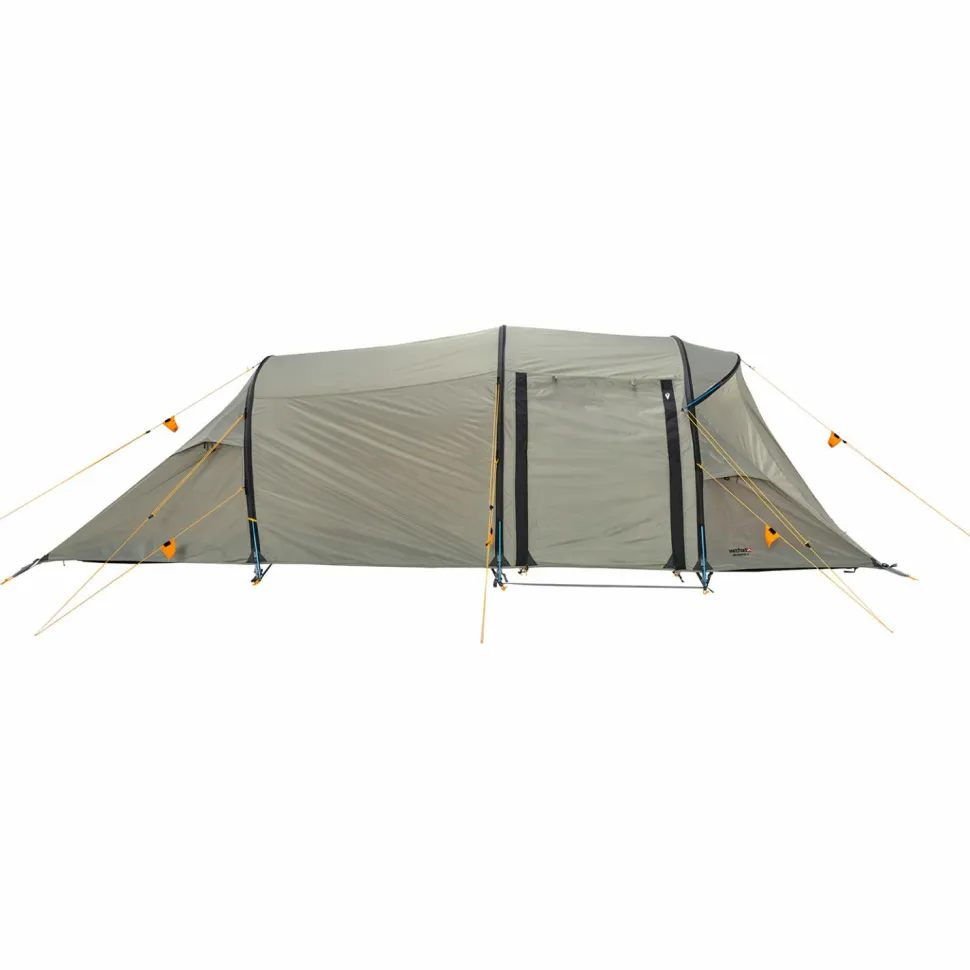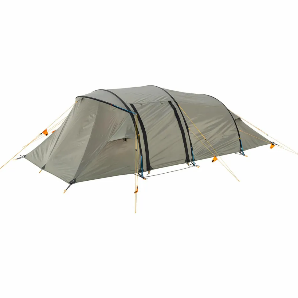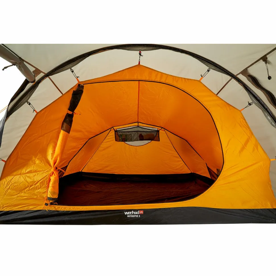 Das Tunnelzelt besitzt eine große Apsis und zwei gegenüberliegende Eingänge, die einen regengeschützten Zugang von beiden Seiten ermöglichen. Der Innenraum ist in einen Vorraum und eine große sowie eine kleine Schlafkabine aufgeteilt, die insgesamt bis zu fünf Personen beherbergen können. Die kleine Kabine ist auf eine Person zugeschnitten und kann bei Bedarf problemlos ausgehängt werden, um die Apsis zu vergrößern. Das Innenzelt aus atmungsaktivem und wasserabweisendem Polyester wirkt der Entstehung von Kondenswasser entgegen und sorgt zusammen mit den vier Apex Ventilationsklappen für eine bestmögliche Luftzirkulation. Die strategisch platzierten Moskitonetze halten die lästigen Blutsauger aus dem Innenraum fern, während die praktischen Netztaschen Stauraum für allerlei Kleinkram bieten. Der mitgelieferte Packsack erleichtert den Transport und macht das Intrepid 5 von Wechsel zum idealen Campingbegleiter!