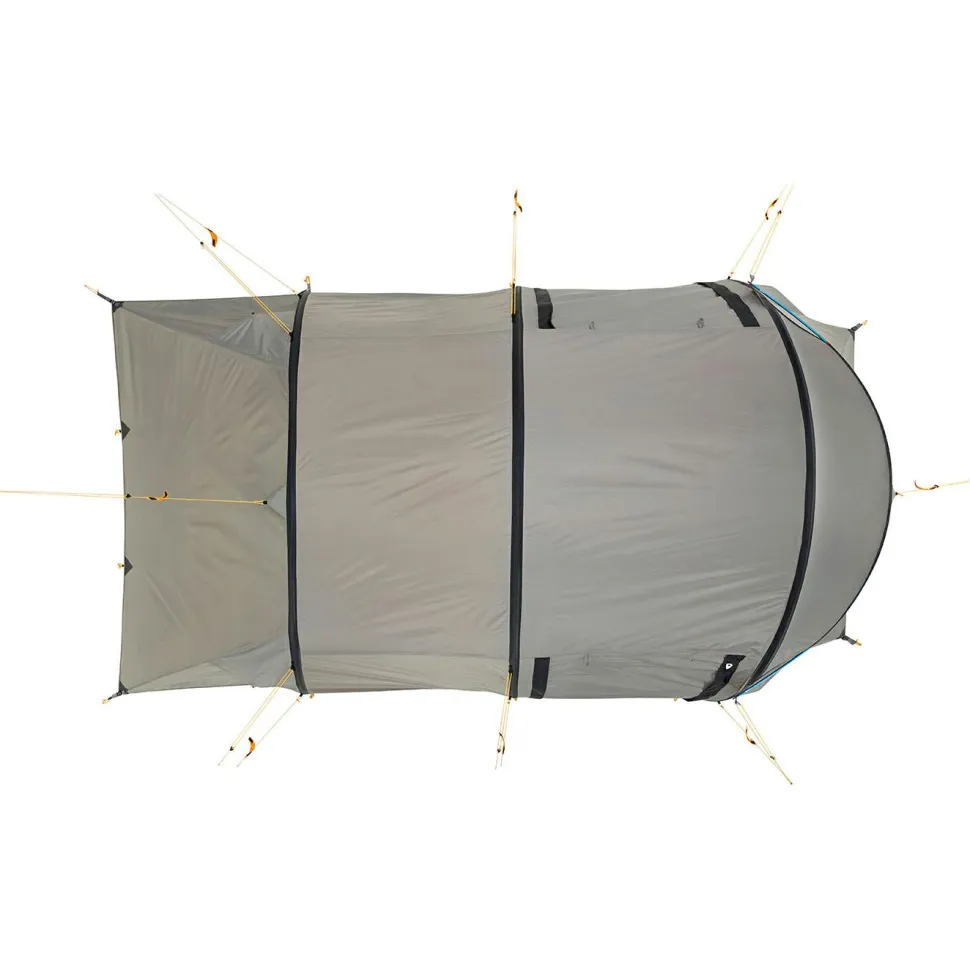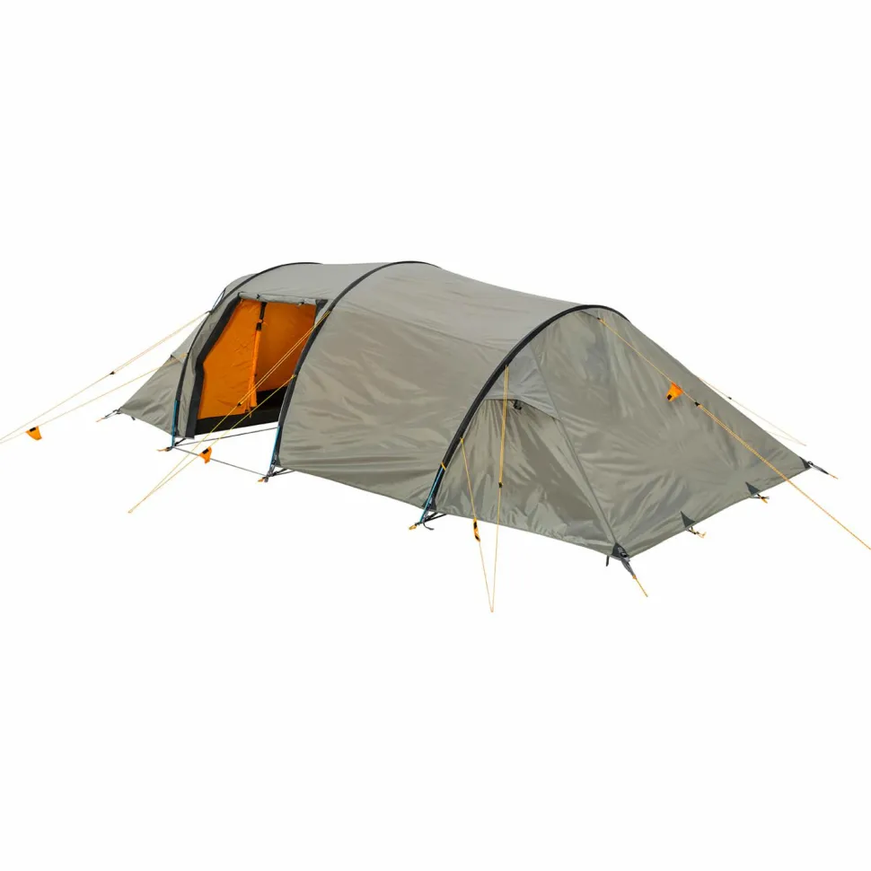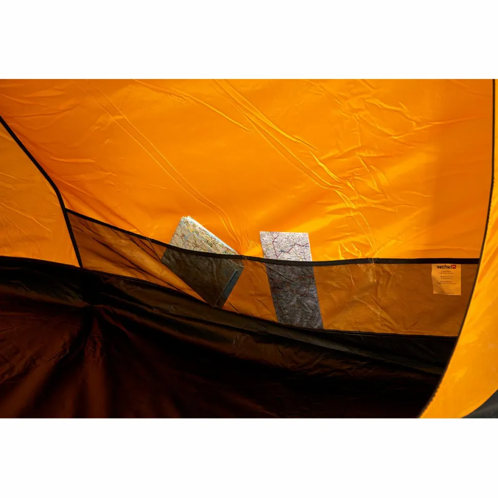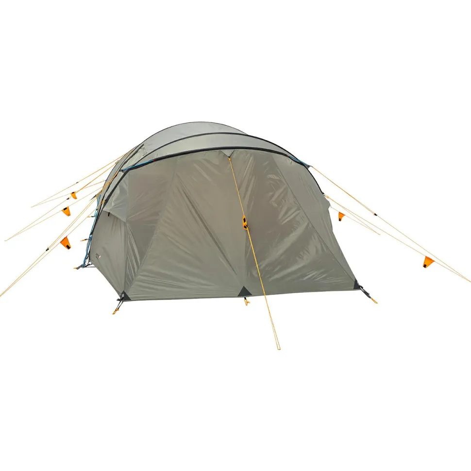 Das Tunnelzelt besitzt eine große Apsis und zwei gegenüberliegende Eingänge, die einen regengeschützten Zugang von beiden Seiten ermöglichen. Der Innenraum ist in einen Vorraum und eine große sowie eine kleine Schlafkabine aufgeteilt, die insgesamt bis zu fünf Personen beherbergen können. Die kleine Kabine ist auf eine Person zugeschnitten und kann bei Bedarf problemlos ausgehängt werden, um die Apsis zu vergrößern. Das Innenzelt aus atmungsaktivem und wasserabweisendem Polyester wirkt der Entstehung von Kondenswasser entgegen und sorgt zusammen mit den vier Apex Ventilationsklappen für eine bestmögliche Luftzirkulation. Die strategisch platzierten Moskitonetze halten die lästigen Blutsauger aus dem Innenraum fern, während die praktischen Netztaschen Stauraum für allerlei Kleinkram bieten. Der mitgelieferte Packsack erleichtert den Transport und macht das Intrepid 5 von Wechsel zum idealen Campingbegleiter!