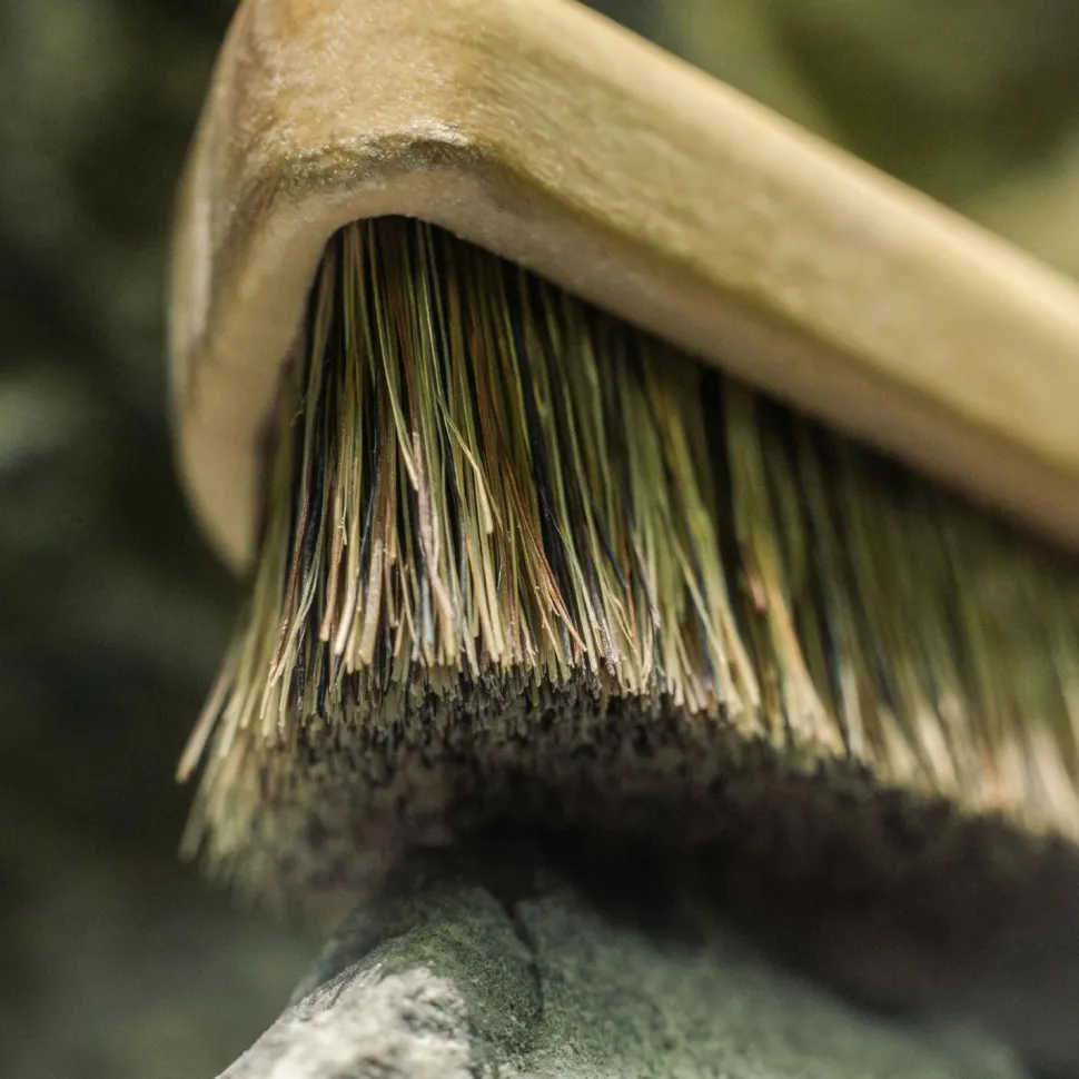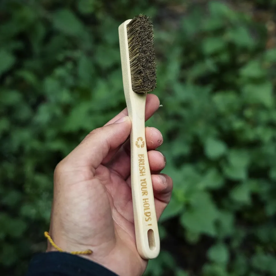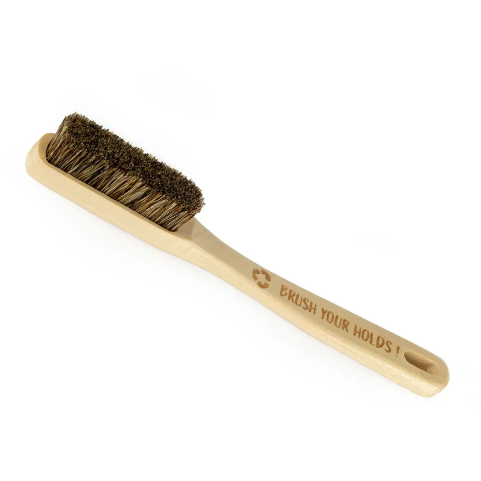 Die VerticalBrush von YY Vertical ist eine Upcycling-Bürste für Klettergriffe, die sich durch ihre hohe Dichte an feinen, steifen Wildschweinborsten auszeichnet. Sie passt sie sich perfekt an die komplexen Formen von Griffen an und erreicht bei der Entfernung von Magnesia sowohl tiefere Ecken und Winkel, als auch die feinen Texturen der Griffoberfläche.