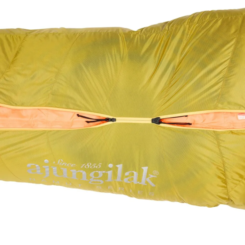 Schlafe genauso gut wie zu Hause in Deinem Bett mit dem Mumienschlafsack Aputi Down Bag -7°C von Ajungilak! Er ist ein komfortabler und warmer Daunenschlafsack für maximalen Komfort im Frühling, Sommer und Herbst. Mit einem tollen Schnitt, einem zentralen Reißverschluss und raschelarmem Material in der Kapuze ist ein erholsamer Schlaf für Dich vorprogrammiert.