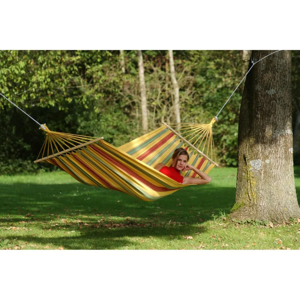 Die Aruba Hängematte von Amazonas kann Dich in Deinem Campingurlaub begleiten, Du kannst sie aber auch einfach in Deinem Garten oder in Deinem Zimmer aufhängen und so auch zu Hause ein Urlaubsgefühl schaffen.Dank des wetterfesten und UV-beständigen Materials kannst Du die Aruba Hängematte auch den ganzen Sommer über draußen hängen lassen, ohne dass sie davon Schaden nimmt.