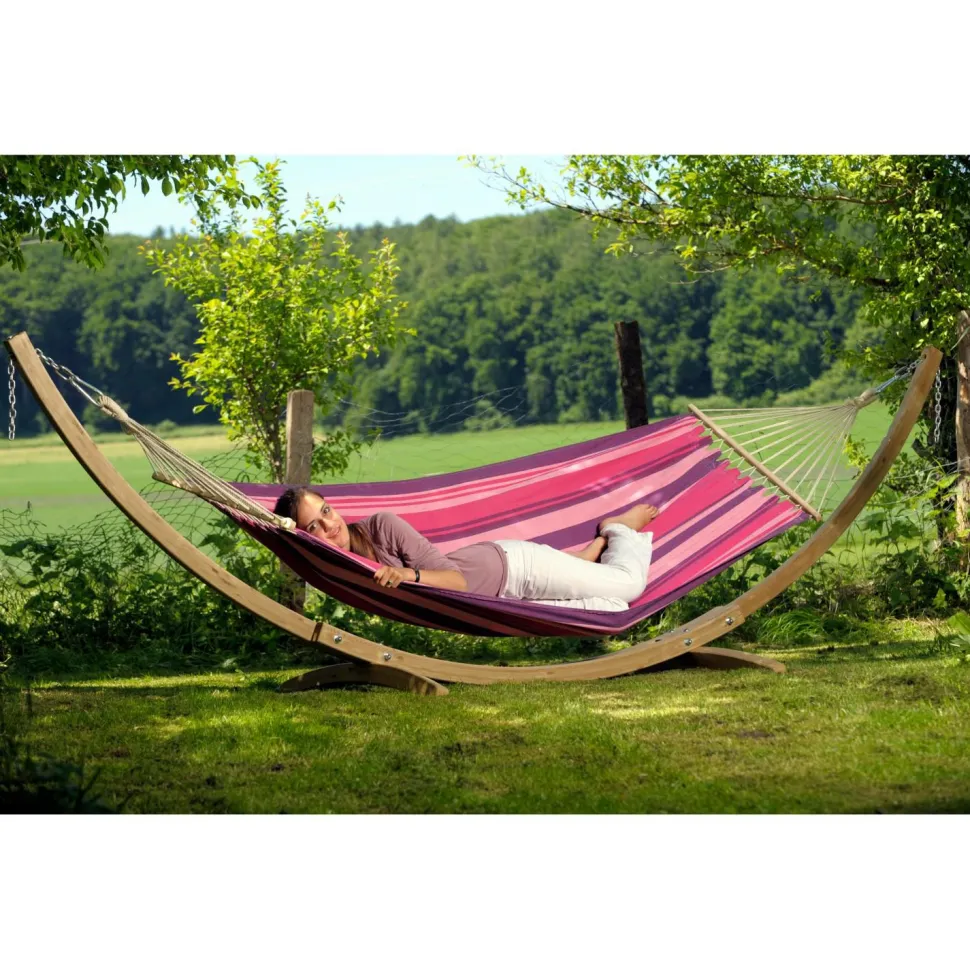 Mit dem schönen Hängemattenset Star Hängemattenset von Amazonas kannst Du Dir Deinen Wohlfühlplatz im Garten schaffen, ohne auf Bäume oder Wände angewiesen zu sein.Die Hängematte selbst ist aus robustem, UV- und wetterbeständigem Baumwollgemisch gefertigt worden und kann problemlos den ganzen Sommer über draußen hängen bleiben. Damit Du die Hängematte in ihrer ganzen Breite ausnutzen kannst, wird sie seitlich von Holzstäben stabilisiert.